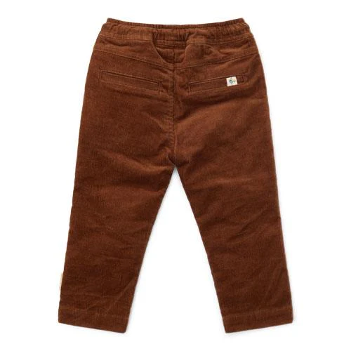 This walnut brown ribbed pants are made from a soft, warm corduroy fabric with a touch of stretch. The pants feature rugged pockets, giving them an adventurous look. The elastic waistband ensures a comfortable and snug fit, while the colored drawstring adds a playful color accent and is easily adjustable. This timeless garment matches with any item from the Farm collection for a complete look. Available in sizes 74, 80, 86, 92, 98, and 104.