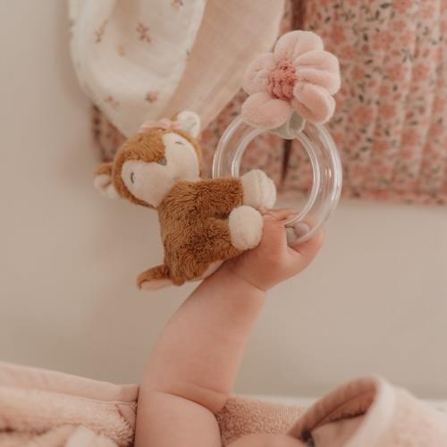 Grab, turn and shake! The sweet deer with her soft fur invites you to play and make this ring rattle heard. The little flower has picked them especially for you to cuddle with. The transparent ring is filled with 3 small beads that rattle when your child plays with it. This attractive baby toy not only stimulates your baby’s senses and curiosity, but also promotes hand-eye coordination.