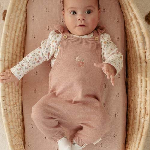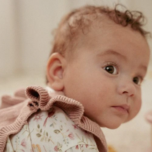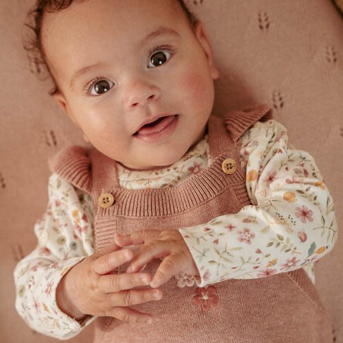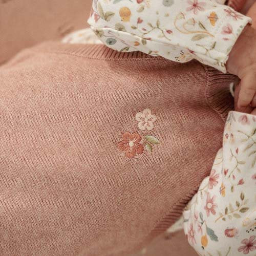 Completely Fairy Pink! This soft knit wraps you in an enchanting melange of pink hues. The cute ruffles on the shoulders add a playful accent to the design, while the delicate floral embroidery on the front makes the whole even sweeter. The wood-look buttons complete the outfit with a touch of elegance. Thanks to the use of organic cotton, this jumpsuit offers comfort, allowing your little one to fully enjoy all daily adventures. Mix and match it with other items from the coordinated Fairy Garden collection. Available in sizes 44, 50, 56, 62, 68, and 74, for the perfect fit from the very beginning.