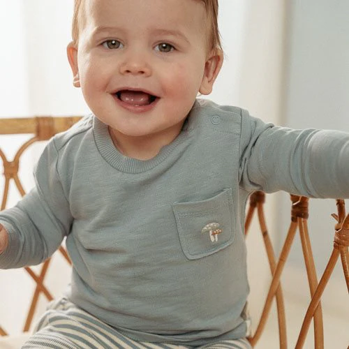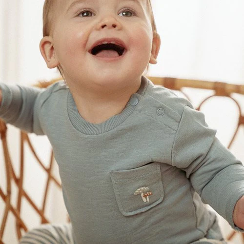 A bundle of blue charm. With this charming Stone Blue long-sleeve t-shirt, you’re ready for an adventure in the forest. Made from organic cotton, this shirt offers softness and freedom of movement for your little one. The chest pocket features a subtle embroidery of two mushrooms, for a playful and stylish accent. The rolled-up sleeves provide a casual and refined look, and the handy snap buttons make dressing very easy. This versatile t-shirt seamlessly matches any item from the Forest Friends collection, ensuring a coordinated style from head to toe. Available in sizes 44, 50, 56, 62, 68, and 74.