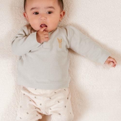 Soft comfort for little adventures! The T-shirt features a cute embroidered detail that inspires farm life. Made from organic cotton with a subtle waffle pattern. The wooden button closure adds a rustic look and makes dressing and undressing easy. Choose a co-ord set with the matching pants or mix and match with other pieces from the Little Farm collection. Made from organic cotton and available in sizes 44, 50, 56, 62, 68, and 74.