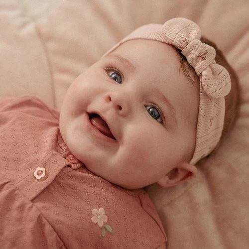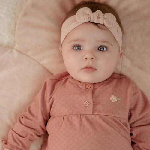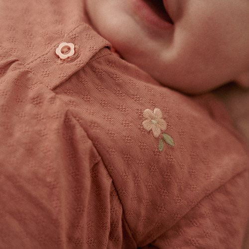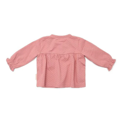 Shine in Pink Blush! This cute long-sleeved t-shirt, made from organic cotton with a fine texture, provides comfort for your little one all day long. The elastic sleeve ends feature charming ruffles, adding a playful touch to the design. Small flower-shaped buttons make dressing your baby easy and emphasize the cute appearance of the shirt. A small embroidered flower gives the front an enchanting accent. Perfect to pair with all items from the coordinated Fairy Garden collection. Available in sizes 44, 50, 56, 62, 68, and 74.