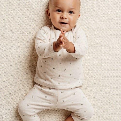 Covered with the green leaves! This long-sleeved T-shirt features a cute all-over print of small green leaves. Made from soft organic cotton in a subtle melange color, it provides comfort throughout the day. For extra convenience, it has two snap buttons on the shoulder, making dressing easier for both baby and parent. Pair with the matching pants or mix and match with all items from the coordinated Little Farm collection. Available in sizes 44, 50, 56, 62, 68, and 74.