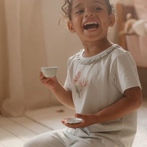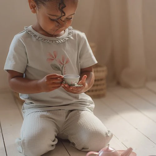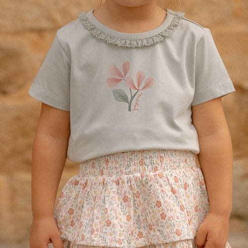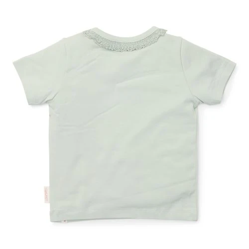 Let your imagination bloom! This enchanting t-shirt is a combination of lovely charm and fine comfort. The soft, Fairy Mint green color gives the shirt a fresh spring feeling. The neckline is adorned with ruffles for a playful and elegant accent. The front of the t-shirt features two beautiful blooming flowers, designed to spark the imagination. Made from organic cotton and available in sizes 74, 80, 86, 92, 98, and 104. Perfect to combine with any item from the complete Fairy Garden collection, allowing you to endlessly mix and match.