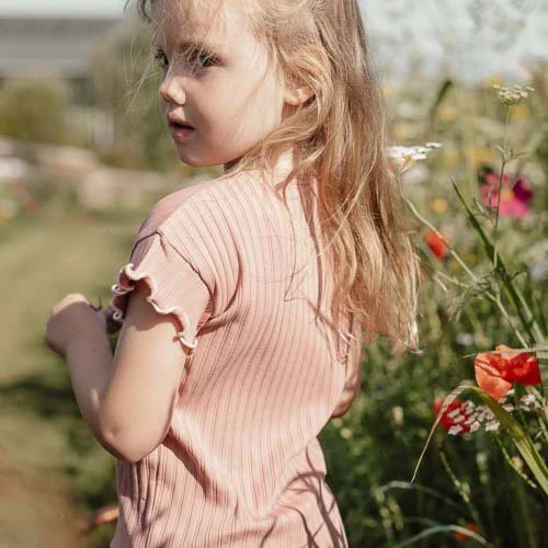 Fluttering Fairies! The ruffles on the sleeves of this beautiful Pink Blush t-shirt are like wings that take you to a garden full of beautiful flowers. Carefully made from soft organic cotton with a soft ribbed texture for a comfortable fit and a cute button closure at the back. The two small embroidered flowers on the chest depict the beautiful blossoms of a lush garden. The subtle stitching at the bottom, in a contrasting color, creates a beautiful ruffled edge for an extra dose of flair. Pair this t-shirt with a skirt, long or short pants from the Fairy Garden collection, and you’re ready for a fairy nice day! Available in sizes 74, 80, 86, 92, 98, and 104.