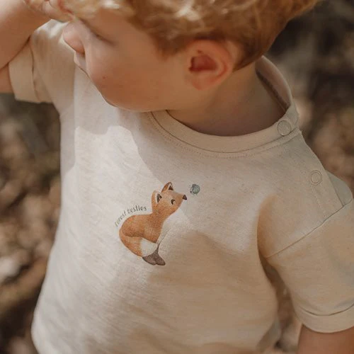 Follow the fox and go on an adventure. This T-shirt in a beautiful sand beige mélange with a cute little fox on the front inspires you to explore the outdoors. Made from soft, breathable organic cotton, it ensures maximum comfort for active boys. The rolled-up sleeves give the classic T-shirt a stylish and modern touch. The Forest Friends collection is carefully designed and coordinated so that each piece can be easily combined with any shorts or long pants from the collection. Available in sizes: 74, 80, 86, 92, 98, and 104.