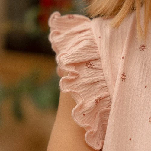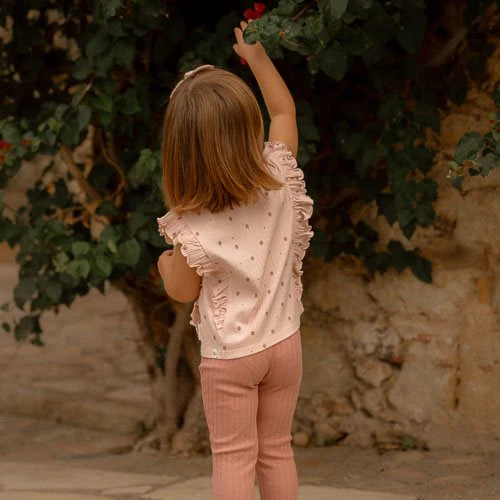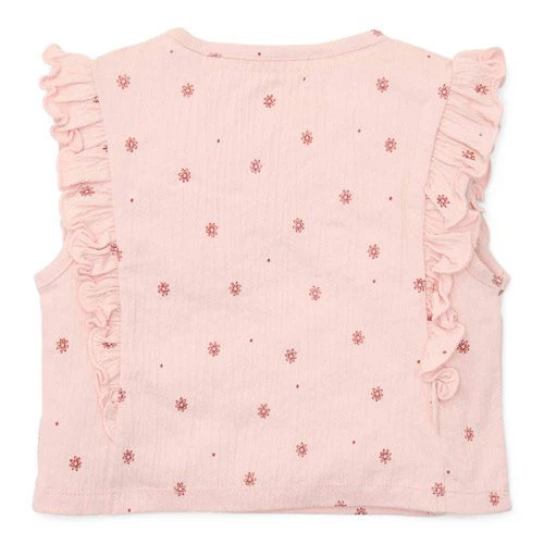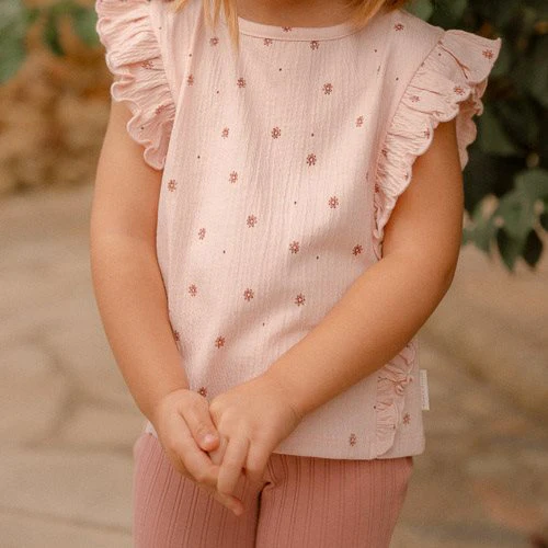 Lotus Blossom Beauty! Let your dreams bloom in this cute sleeveless t-shirt! Every time you wear this charming top, it brings out a graceful and playful look. The enchanting Fairy Garden Flower print adds a touch of natural beauty, while the ruffles along both sides of the shirt enhance this look. Made from soft organic cotton, this t-shirt is comfortable and perfect for warm, sunny days. Pair it with any piece from the coordinated Fairy Garden collection. Available in sizes 74, 80, 86, 92, 98, and 104.