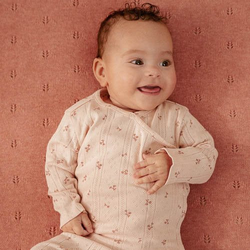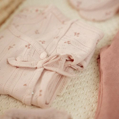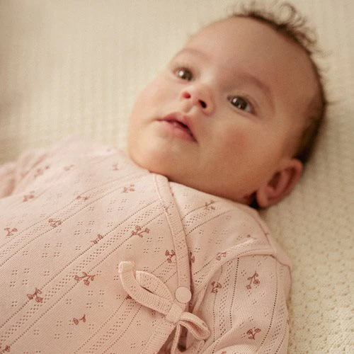 Wrap your baby in love from the very first moment. Made from soft organic cotton, this t-shirt combines comfort with a beautiful design. The refined pointelle structure of the fabric, in a lovely light pink shade, is adorned with an enchanting print of small flowers. The wrap design ensures easy dressing and undressing of your little one, and a small fixed bow adds a sweet finishing touch. Opt for a coordinated set with the matching leggings or mix and match with any other item from the Fairy Garden collection. Available in sizes 44, 50, 56, 62, 68, and 74.