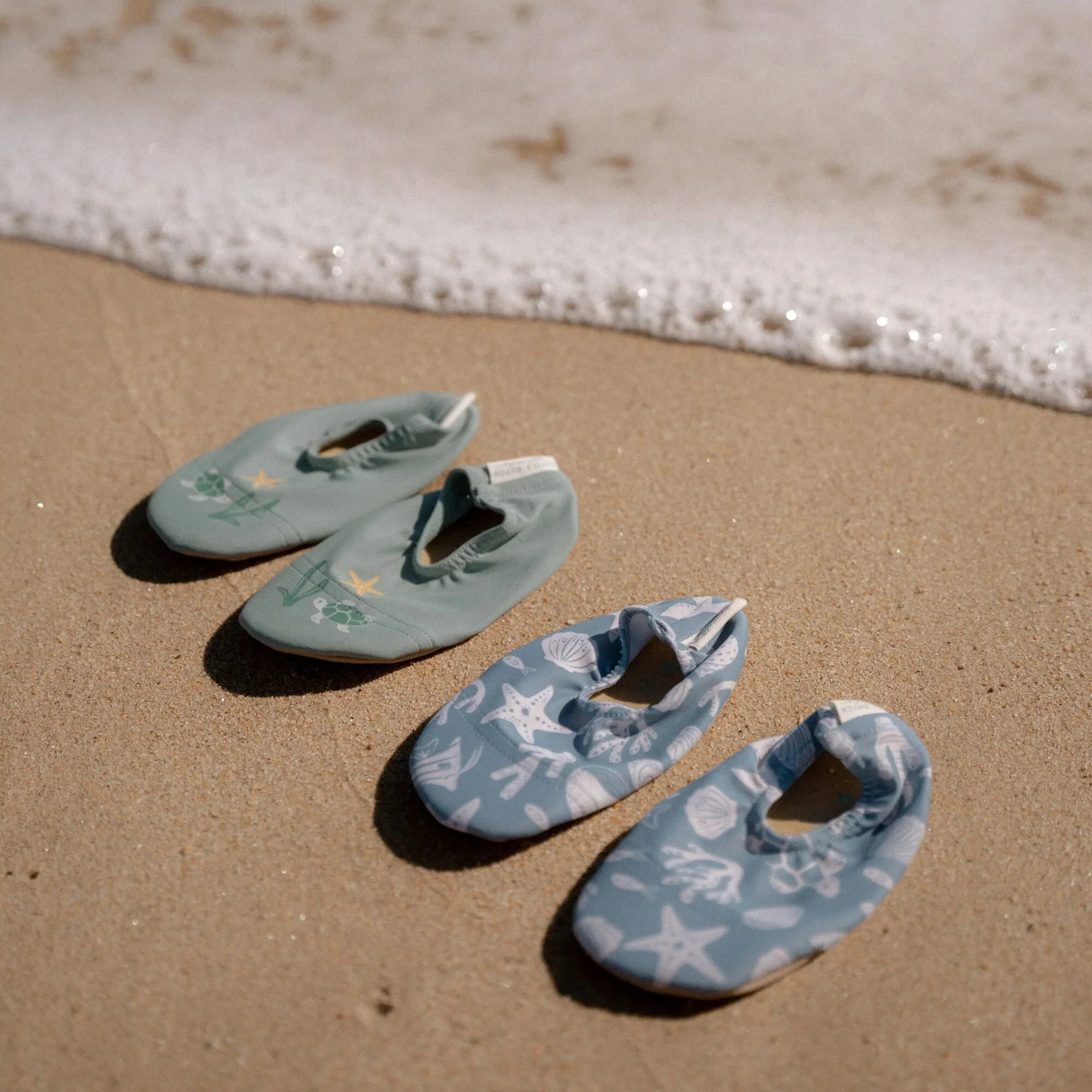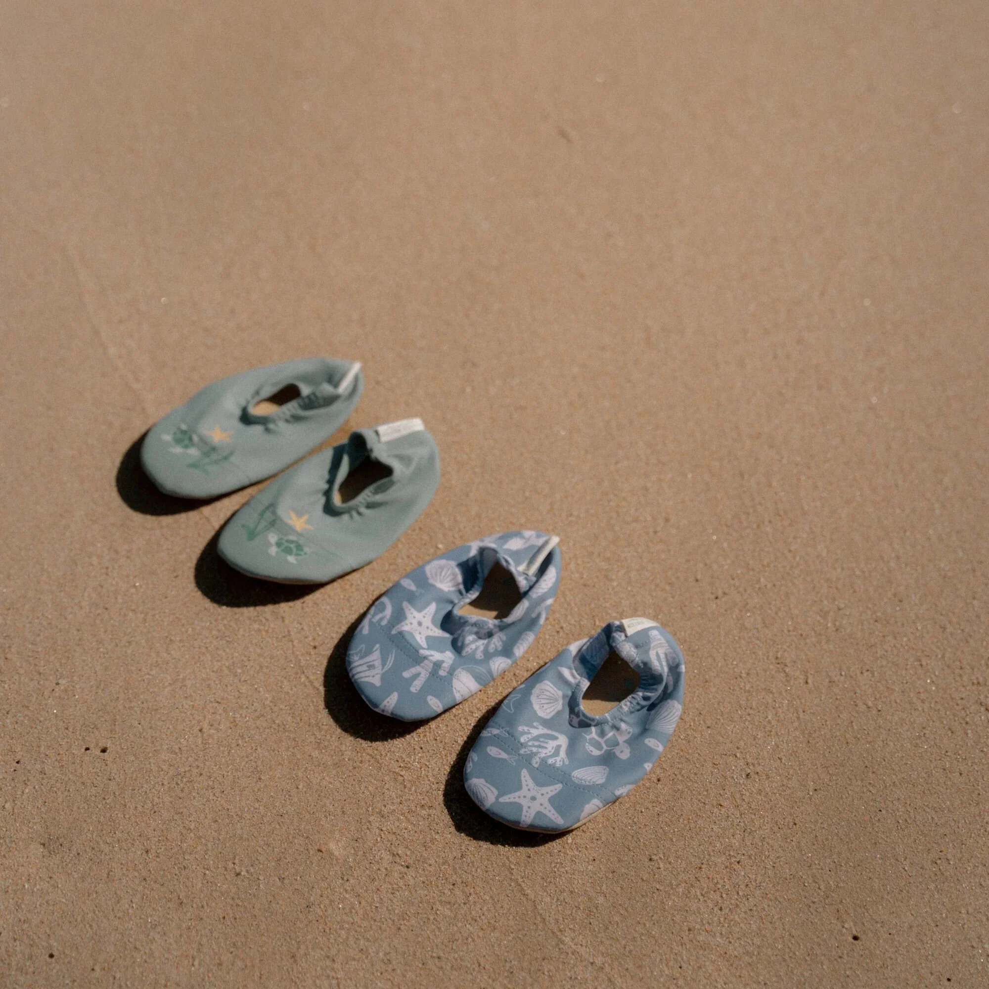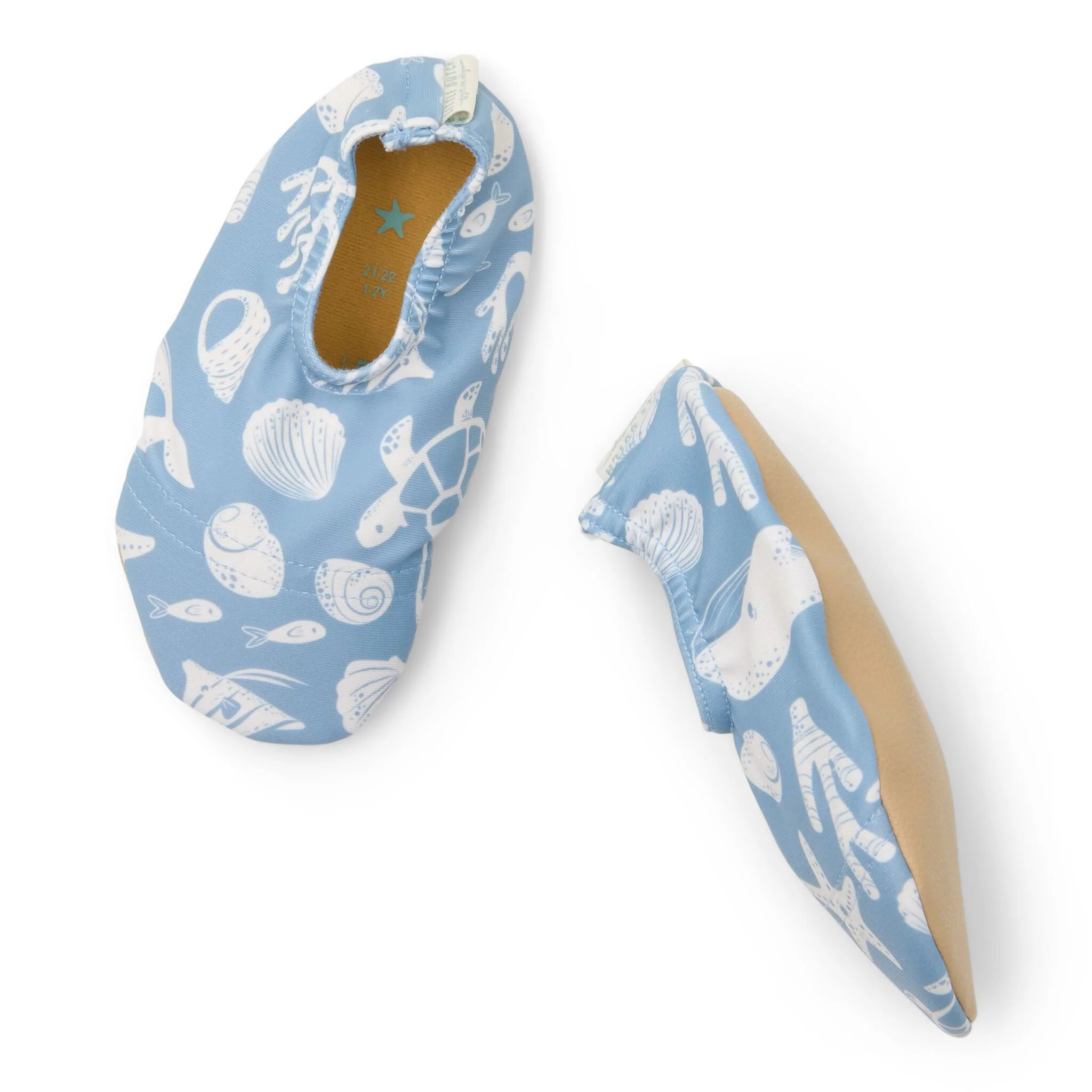 Over the warm sand, the sharp shells, and off to the sea! With these swim shoes, your feet remain protected and comfortable during beach outings. So, jump off that beach towel and let’s build a sandcastle!The flexible and elastic fit ensures that your little one can explore and play freely. Made from high-quality polyester, these shoes protect delicate feet from the hot beach sand. They also offer excellent grip and stability on various surfaces, from sandy beaches to slippery pools.The charming blue Ocean Sea Life design, adorned with shells, starfish, and whales, gives a playful and lively look to your child’s beachwear. These swim shoes are designed to be easy to put on and take off, making them ideal for busy parents and active toddlers. Available in sizes 19-20, 21-22, 23-24, 25-26, and 27-28. Pair with the matching long-sleeve swimsuit for an Ocean Sea Life look from head to toe.