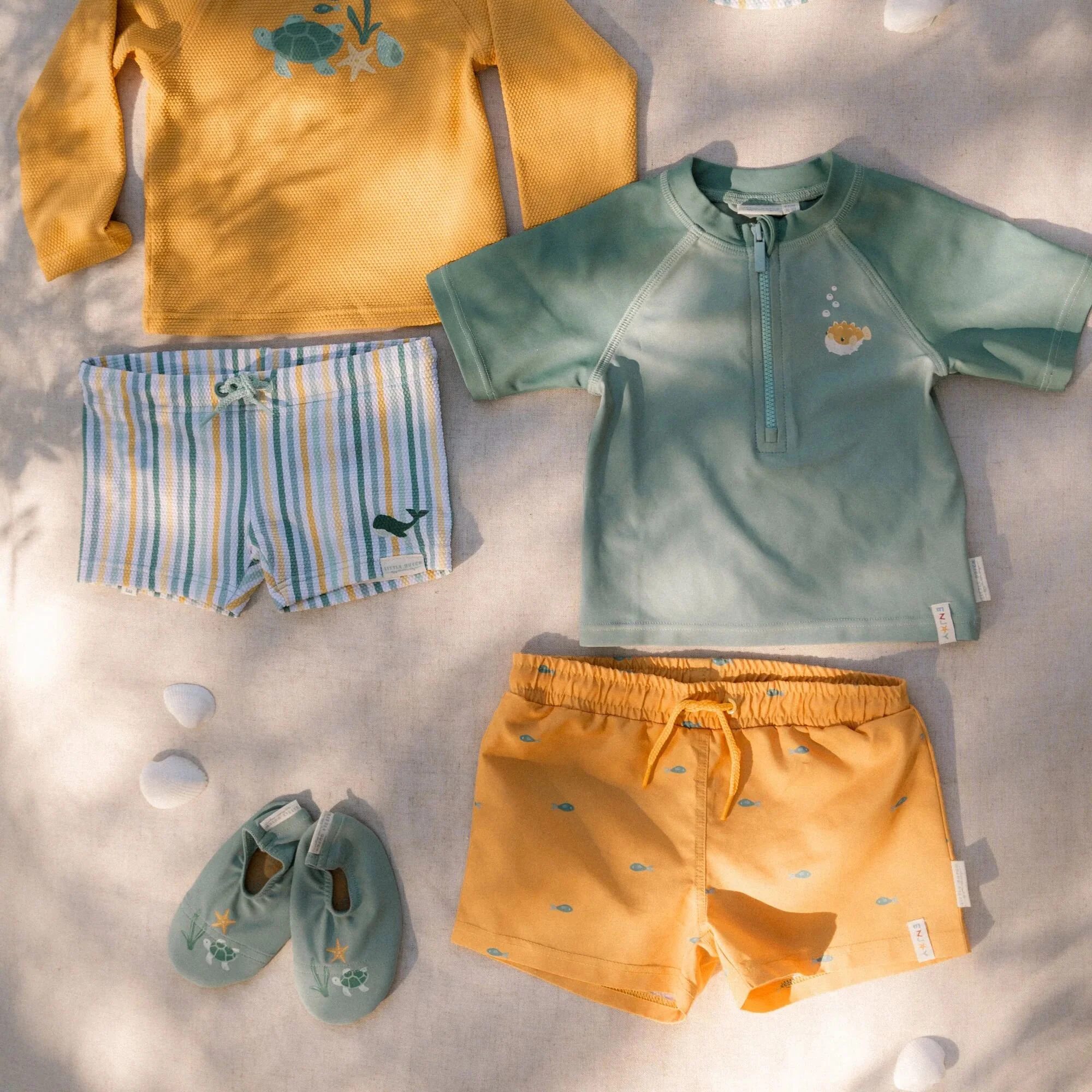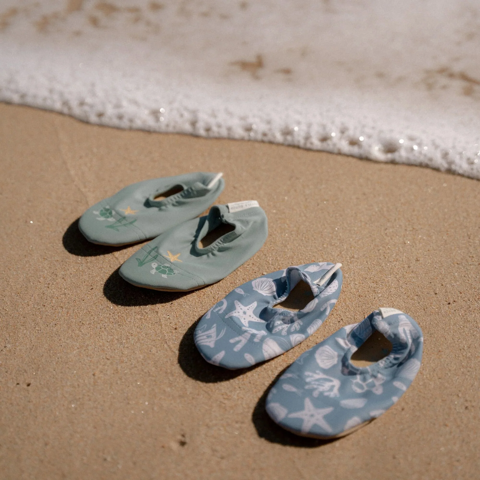 Over the warm sand, the sharp shells, and off to the sea! With these swim shoes, your feet remain protected and comfortable during beach outings. So, jump off that beach towel and let’s build a sandcastle!The flexible and elastic fit ensures that your little one can explore and play freely. Made from high-quality polyester, these shoes protect delicate feet from the hot beach sand. They also offer excellent grip and stability on various surfaces, from sandy beaches to slippery pools.The cute Blue Surf color is adorned with a friendly turtle swimming around the coral to inspire ocean adventures and spark curiosity about marine life. These swim shoes are designed to be easy to put on and take off, making them ideal for busy parents and active toddlers. Available in sizes 19-20, 21-22, 23-24, 25-26, and 27-28. Pair them with matching swim shorts and a long-sleeve swim shirt for the complete Blue Surf look.