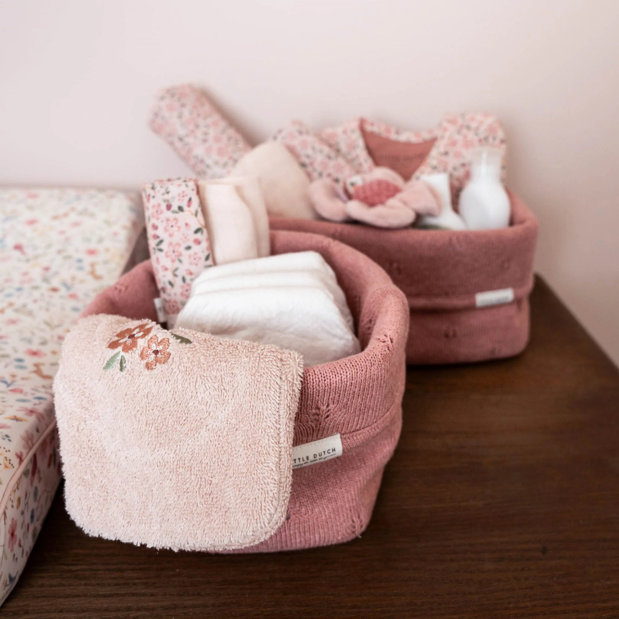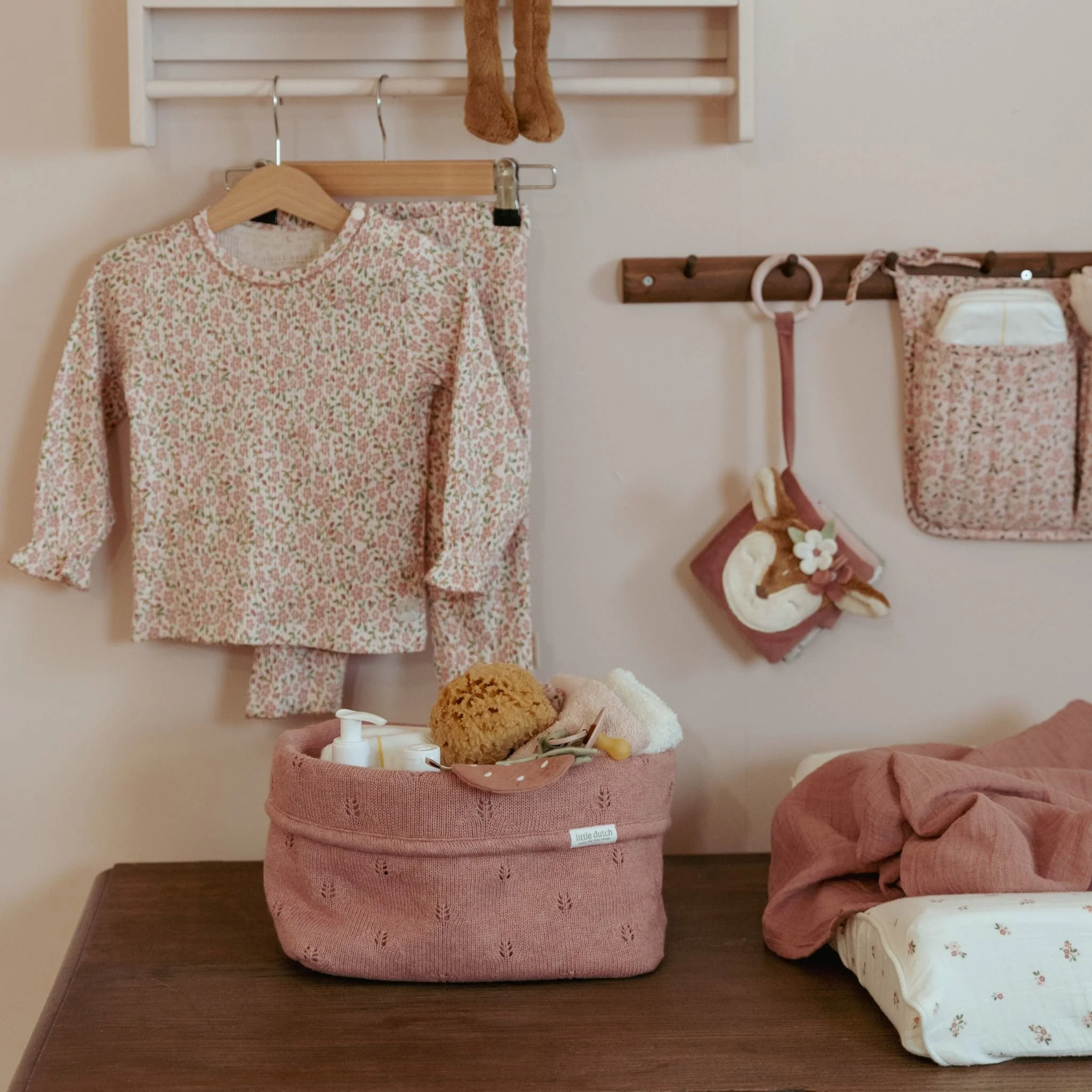 With this storage basket, the changing table remains tidy and organized. Made from knitted 100% organic cotton with reinforced sides, it offers ample space for all your daily essentials for caring for your little one, such as diapers, tubes, and bottles. The fold-over edge allows you to use the basket at two heights. With a fine pointelle design of delicate leaves and a sweet Pure Blossom color, it adds a classic and romantic touch to any room. Available in two sizes.