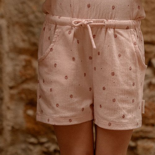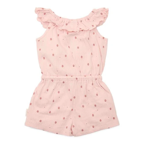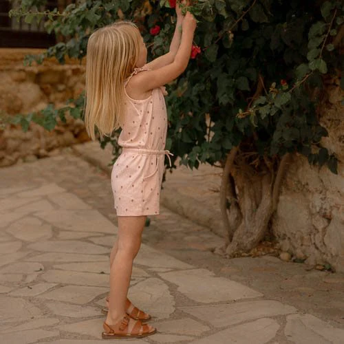 Play and shine in lotus pink this summer! This jumpsuit is the perfect one-piece garment for little adventurers. Made from comfortable crinkle-quality fabric with stretch, it ensures freedom of movement and all-day comfort. The charming floral pattern and the ruffles at the neckline give the outfit an extra sweet and lovely appearance. The elastic neckline and waist make dressing and undressing easy, and with the drawstring at the waist, you can adjust the fit. Made from organic cotton, the jumpsuit has handy pockets for little finds. Pair it on colder days with the matching cardigan from the Fairy Garden collection to keep shining in lotus blossom. Available in sizes 74, 80, 86, 92, 98, and 104.