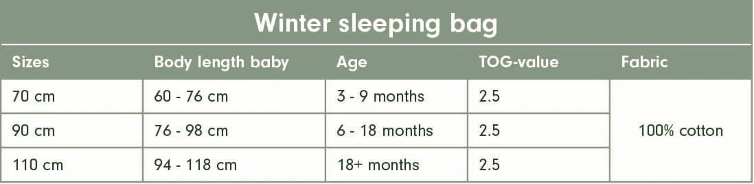 Warning WAARSCHUWING! Niet gebruiken als het hoofd van het kindje door de halsopening kan schuiven. Zorg dat de hals- en mouwopeningen goed gesloten zijn. Niet gebruiken als het kind uit het bed kan klimmen. Niet in combinatie met een dekbed of deken gebruiken. Houd rekening met de kamertemperatuur en de slaapkleding van het kind. Oververhitting kan het leven van het kind in gevaar brengen! Stop met gebruik van de slaapzak als deze beschadigd is. Uit de buurt van vuur houden. Onderhoudsinstructies conform EN ISO 3758. Niet professioneel droogreinigen.