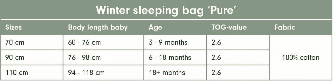| Warning | WAARSCHUWING! Niet gebruiken als het hoofd van het kindje door de halsopening kan schuiven. Zorg dat de hals- en mouwopeningen goed gesloten zijn. Niet gebruiken als het kind uit het bed kan klimmen. Niet in combinatie met een dekbed of deken gebruiken. Houd rekening met de kamertemperatuur en de slaapkleding van het kind. Oververhitting kan het leven van het kind in gevaar brengen! Stop met gebruik van de slaapzak als deze beschadigd is. Uit de buurt van vuur houden. Onderhoudsinstructies conform EN ISO 3758. Niet professioneel droogreinigen. |