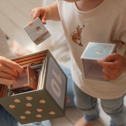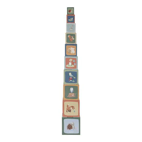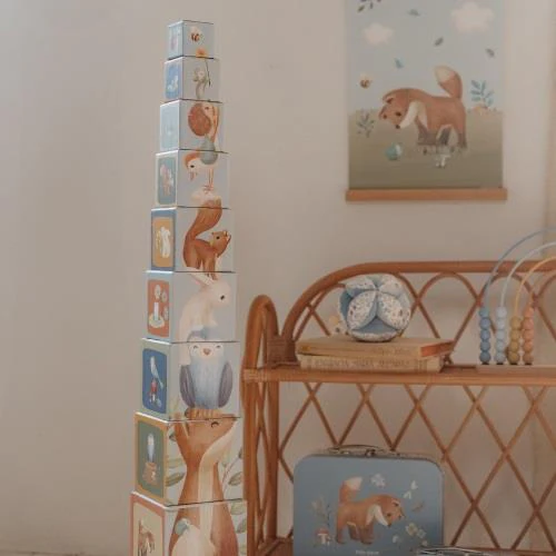 Stack one block on top of the other and watch the magic of Forest Friends grow! You can stack the blocks on top of each other to create a tall tower or lay them horizontally on the ground. Discover four enchanting scenes as you build. Place one animal on top of the other, from large to small. Sort them in two ways by counting, or collect all the images from the enchanted forest. Children learn to count to 10 playfully with these stacking blocks. The blocks feature beautiful illustrations from the Forest Friends collection, including squirrels, foxes, bunnies, hedgehogs, owls, and mushrooms. To store them easily, the smaller blocks fit into the larger ones. Made of sturdy cardboard, the blocks can withstand a bump. The smallest block measures 5 cm and the largest is 14 cm.