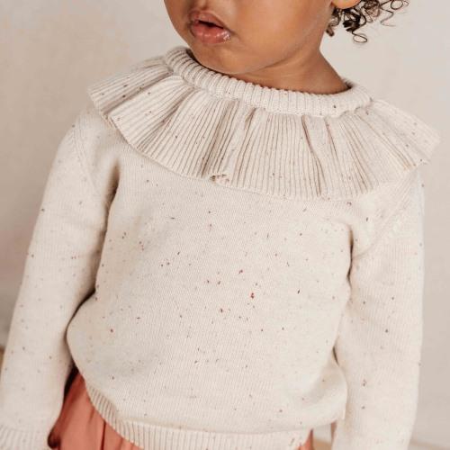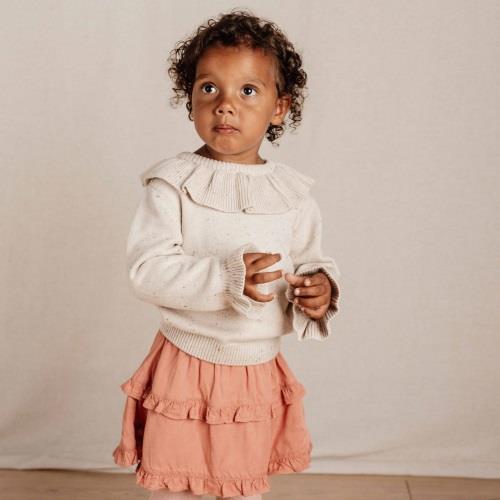 Stay warm and stylish with this beautiful knitted sweater in a stunning sand color. Made from soft, organic cotton, this sweater provides both comfort and style. The ruffle around the neckline and the elastic cuffs add a playful twist. Mix and match with the skirts, pants, or shorts from the complete Farm collection. Available in sizes 74, 80, 86, 92, 98, and 104.