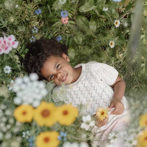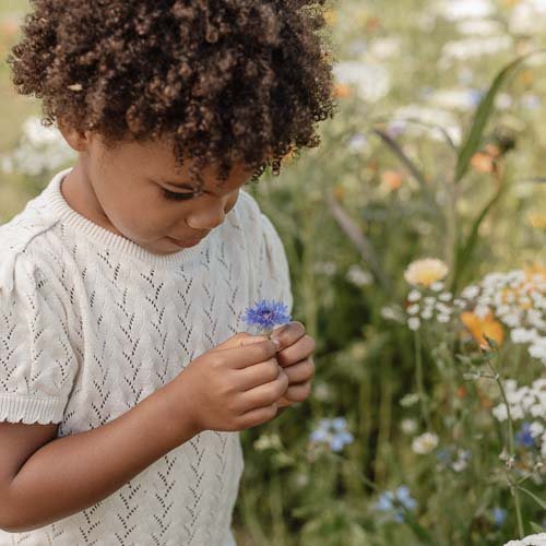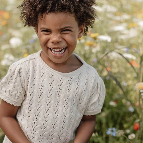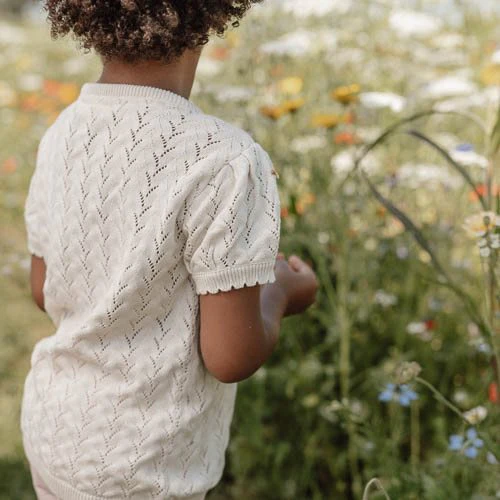 For little ones with big dreams. Explore the wonders of the world with elegance and style. This short-sleeved knitted sweater is made from soft organic cotton with a slightly open structure, ensuring you can play in comfort all day long. The scalloped edges of the puff sleeves give the sweater a romantic touch and a hint of whimsy. Combine and mix with any piece from the coordinated Fairy Garden collection. Available in sizes 74, 80, 86, 92, 98, and 104.
