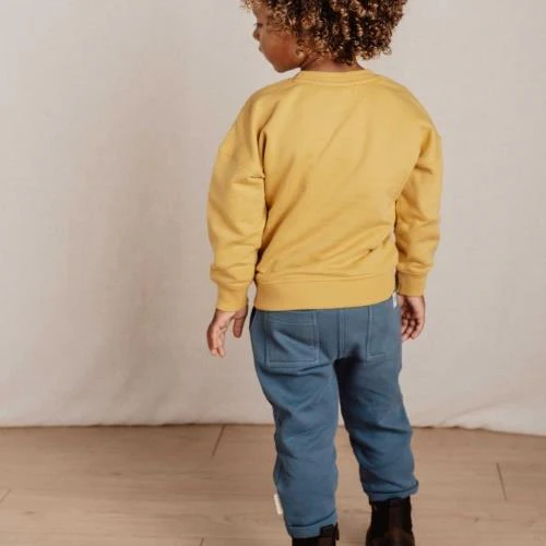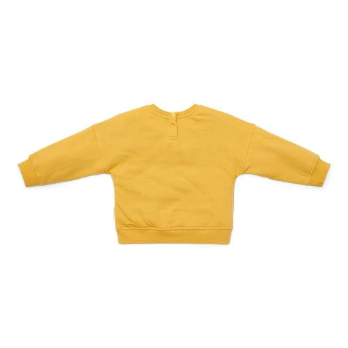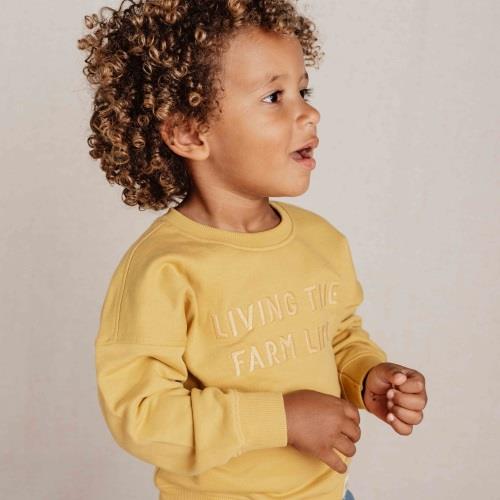 Living the farm life! This mustard yellow sweater is made from organic cotton with an extra soft interior, providing comfort during cooler days. The front features embroidered text “Living the farm life”, adding a playful touch. The sweater seamlessly combines with all items from the Farm collection, so you are styled from head to toe. Available in sizes 74, 80, 86, 92, 98, and 104.