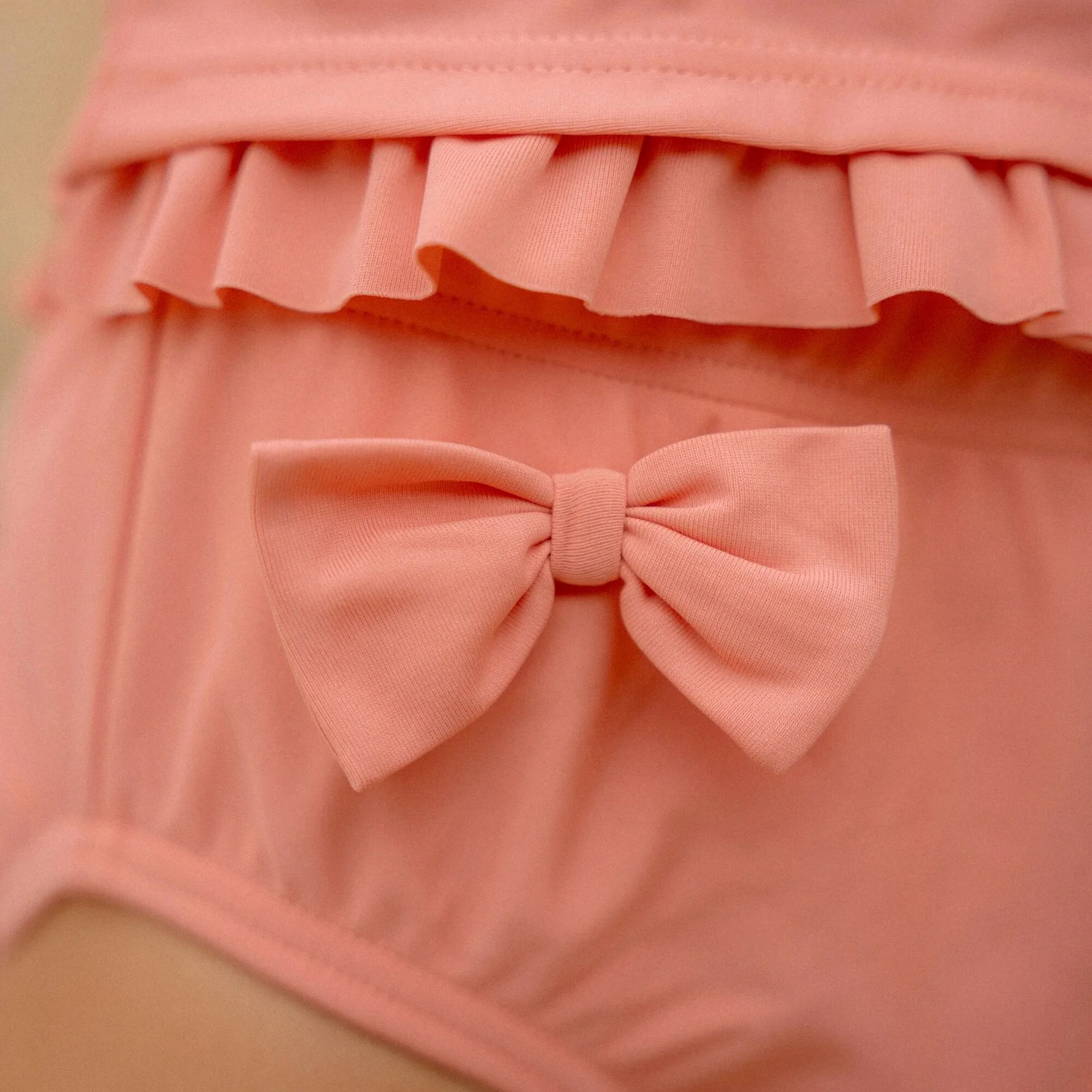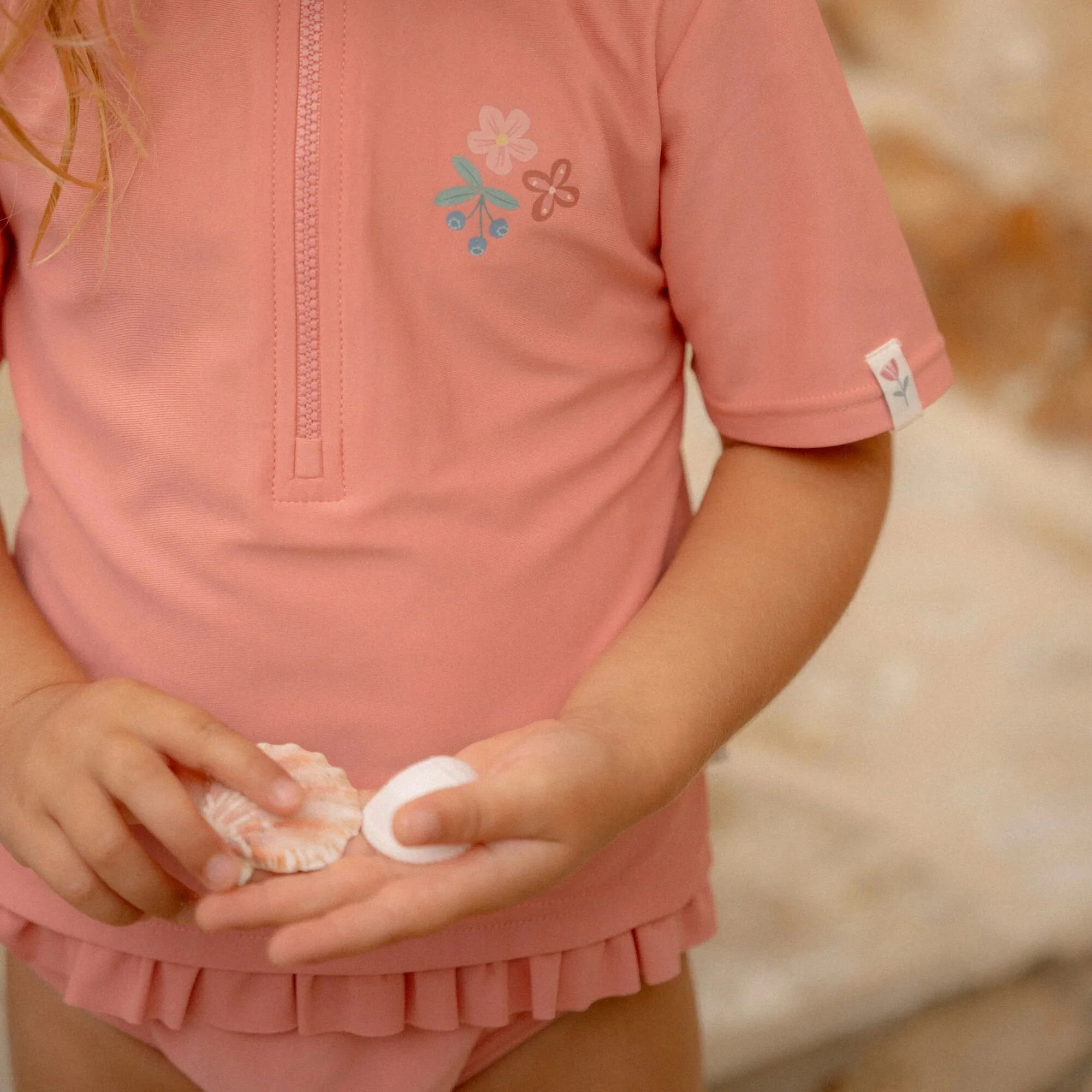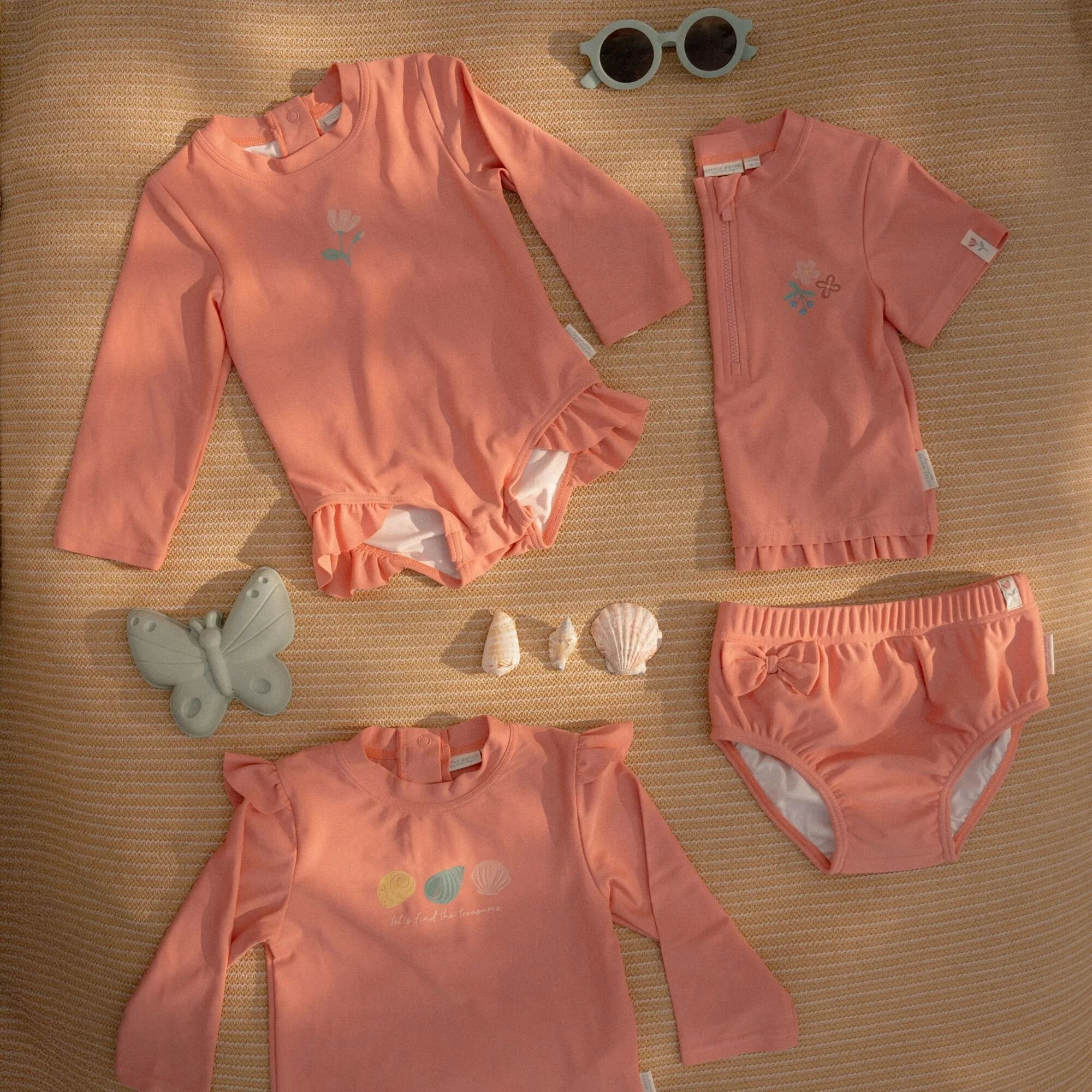 Let’s jump into the water and have a splashing day! Don’t worry—this swim diaper keeps all accidents contained, so you can splash around to your heart’s content. The swim diaper is designed to let parents and little ones enjoy water fun without worries. The elastic waistband and leg cuffs ensure a perfect fit, allowing your child to move freely and comfortably in the water without concerns about leakage.The material does not absorb water, keeping the swim diaper light and comfortable during swimming. The waterproof outer layer prevents anything from escaping the diaper, and any accidents are prevented. Perfect for families who often go to the beach or pool, as the swim diaper is easy to wash and reuse. Just throw it in the wash after use, and it’s ready for the next water adventure. Available in sizes 62/68, 74/80, 86/92, and 98/104.With the Sunny Flowers design in a beautiful pink color with a floral print, this swim diaper is perfect to pair with the short-sleeved swim shirt to create a stylish two-piece swimsuit. The bow on the side adds an extra refined detail to the swim diaper. Always use sunscreen to ensure maximum protection for your little one.