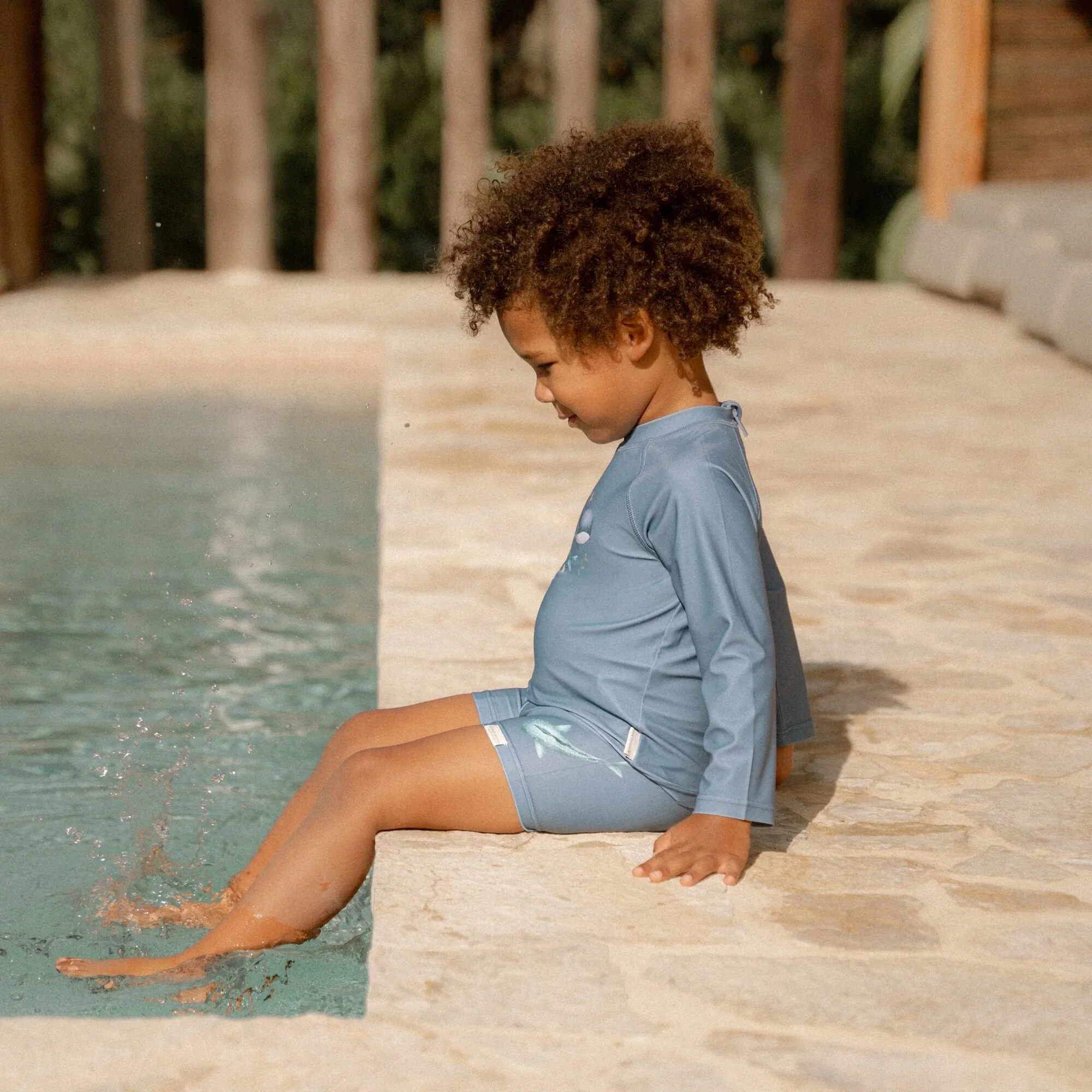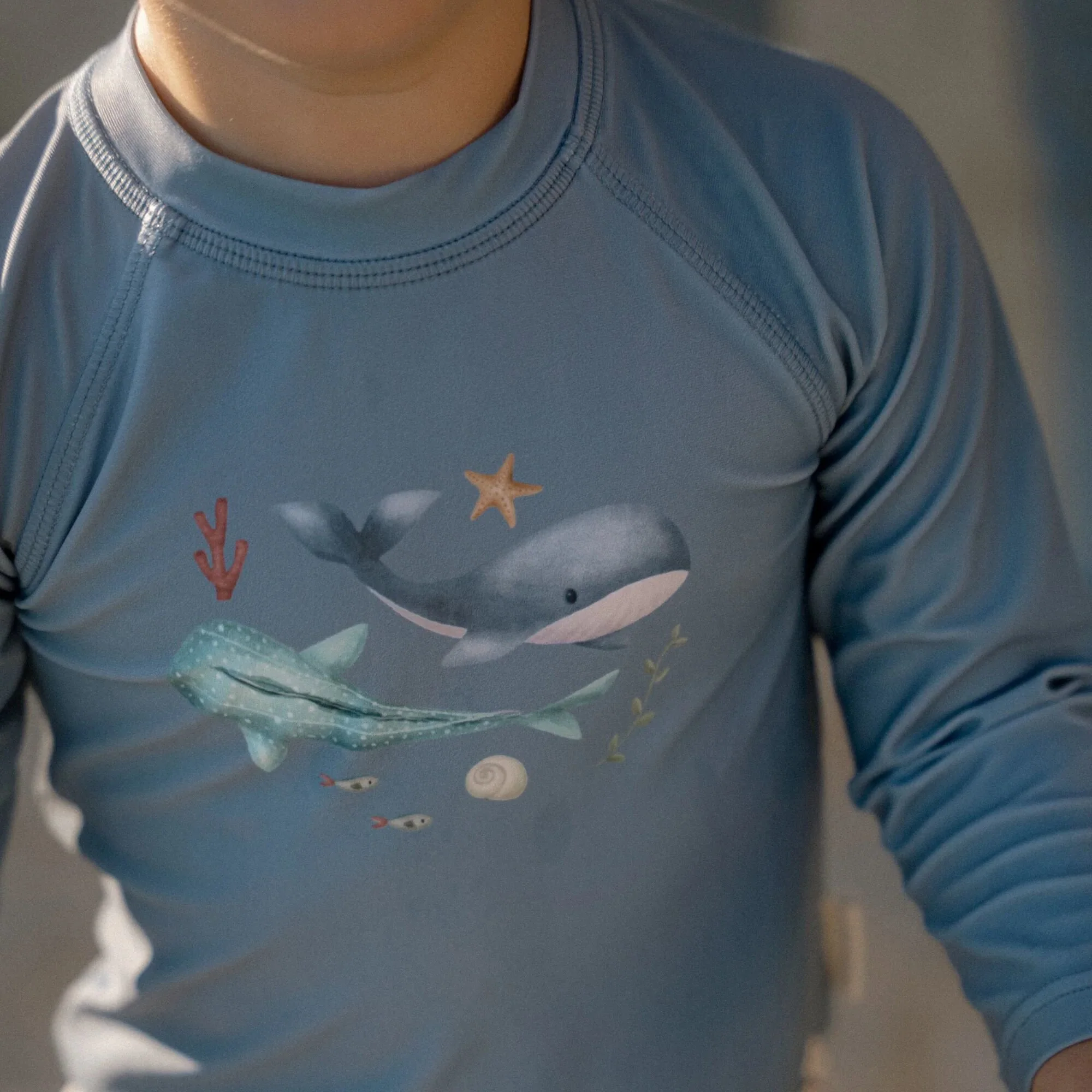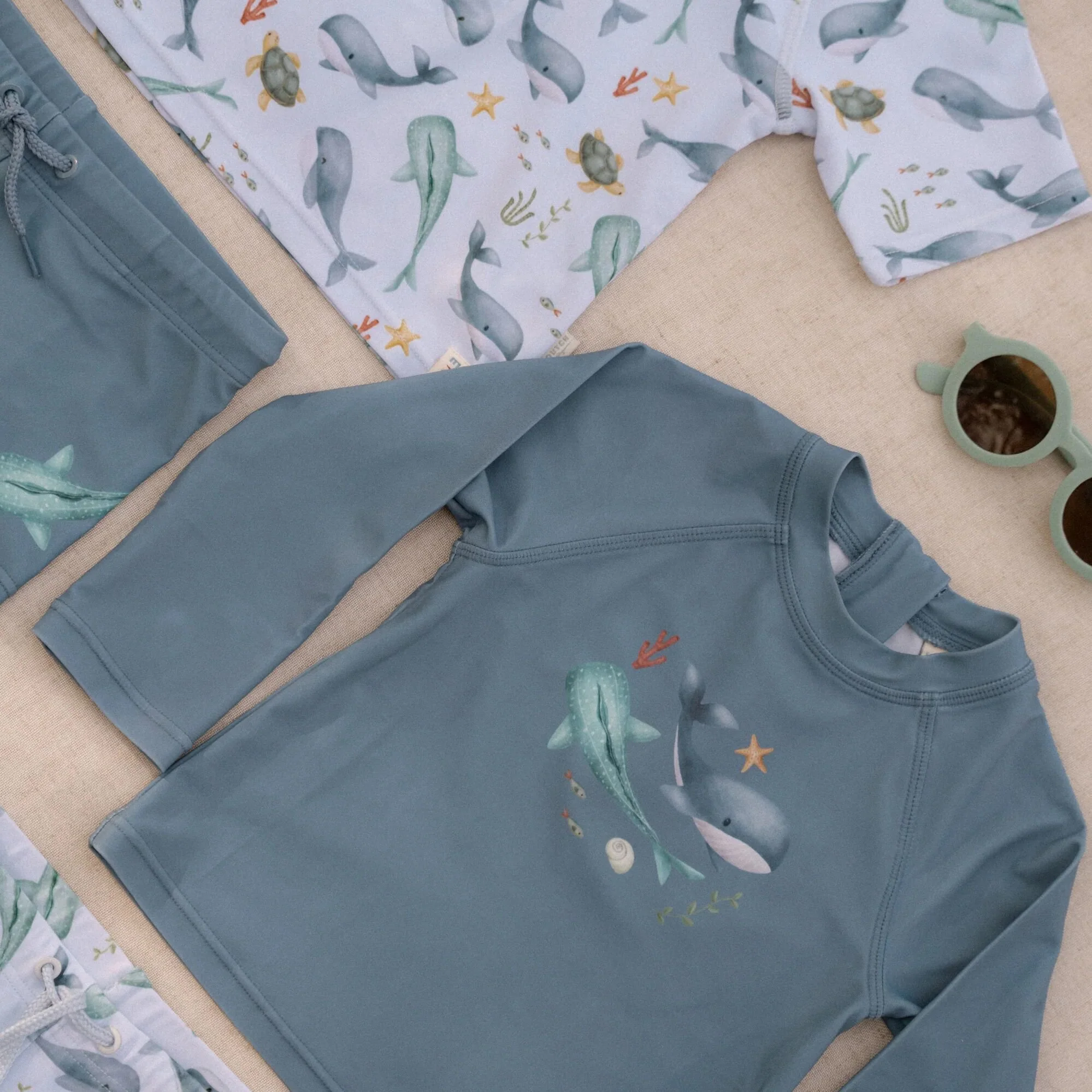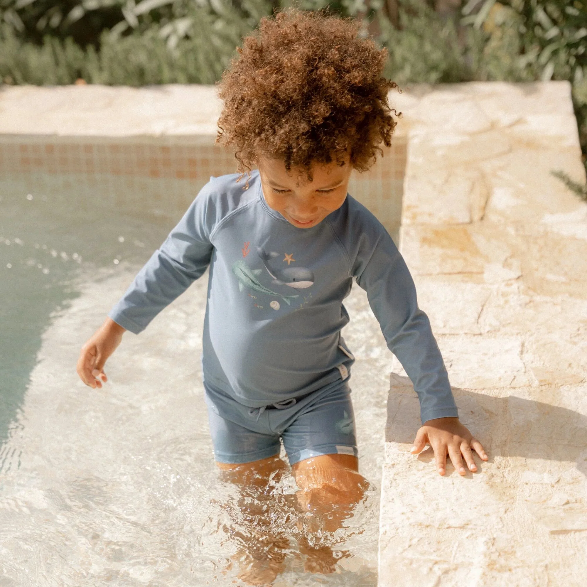 Embrace the sunshine and let the adventure begin! Put on your swim shirt and grab your favorite beach toys for a day full of water fun. This swim shirt provides warmth in the water and protects you from the sun, allowing you to play all day long. In a stylish Ocean Blue shade with two cute whales on the front, this long-sleeved swim shirt not only gives your little surfer a cool nautical look but also ensures a comfortable fit. Thanks to the handy zipper at the back, it’s easy to put on and take off, even when your little one is wet and sandy. Available in sizes 62/68, 74/80, 86/92, and 98/104.Complete the look with the matching swim trunks and a bucket hat. Don’t forget to always use sunscreen to give your little one extra protection.