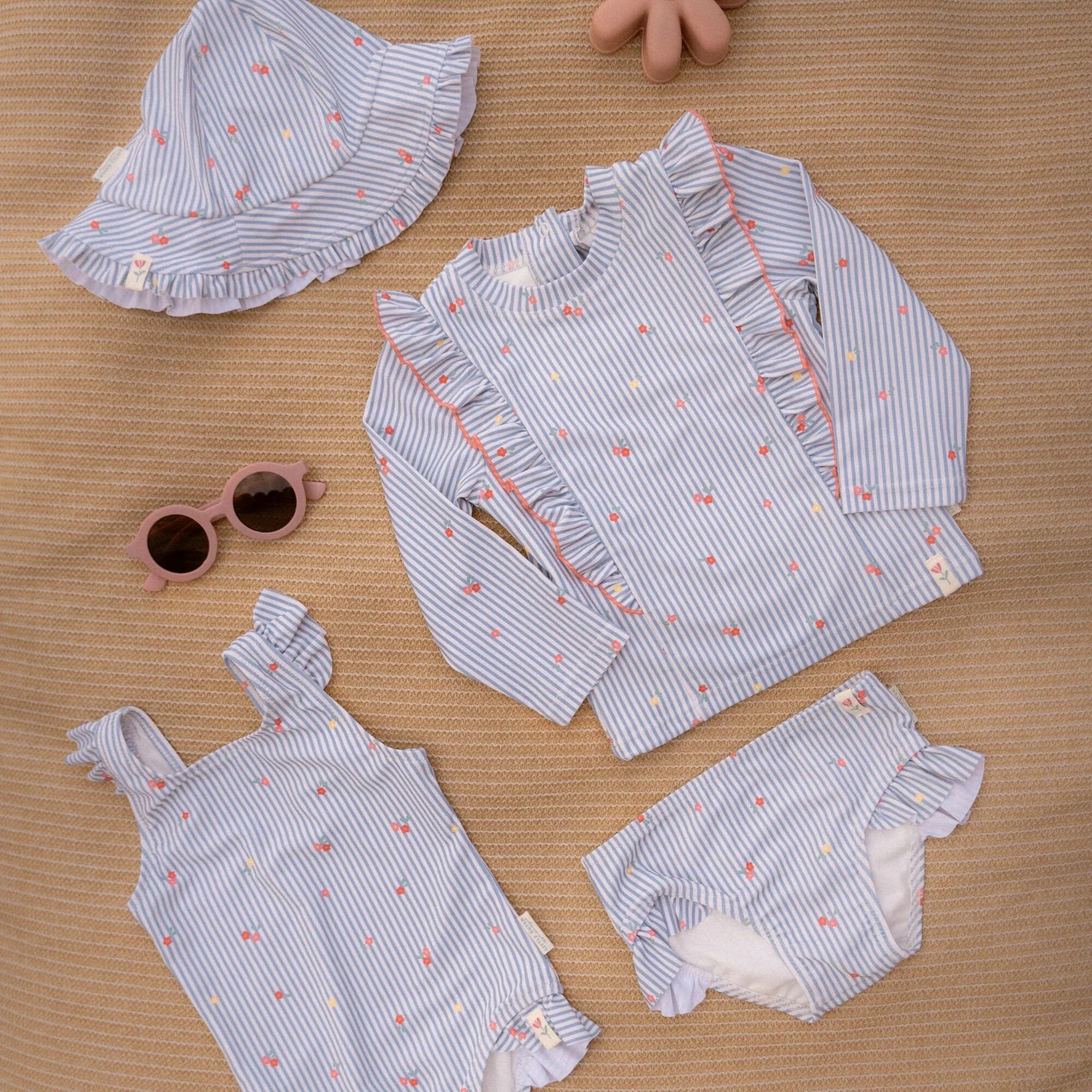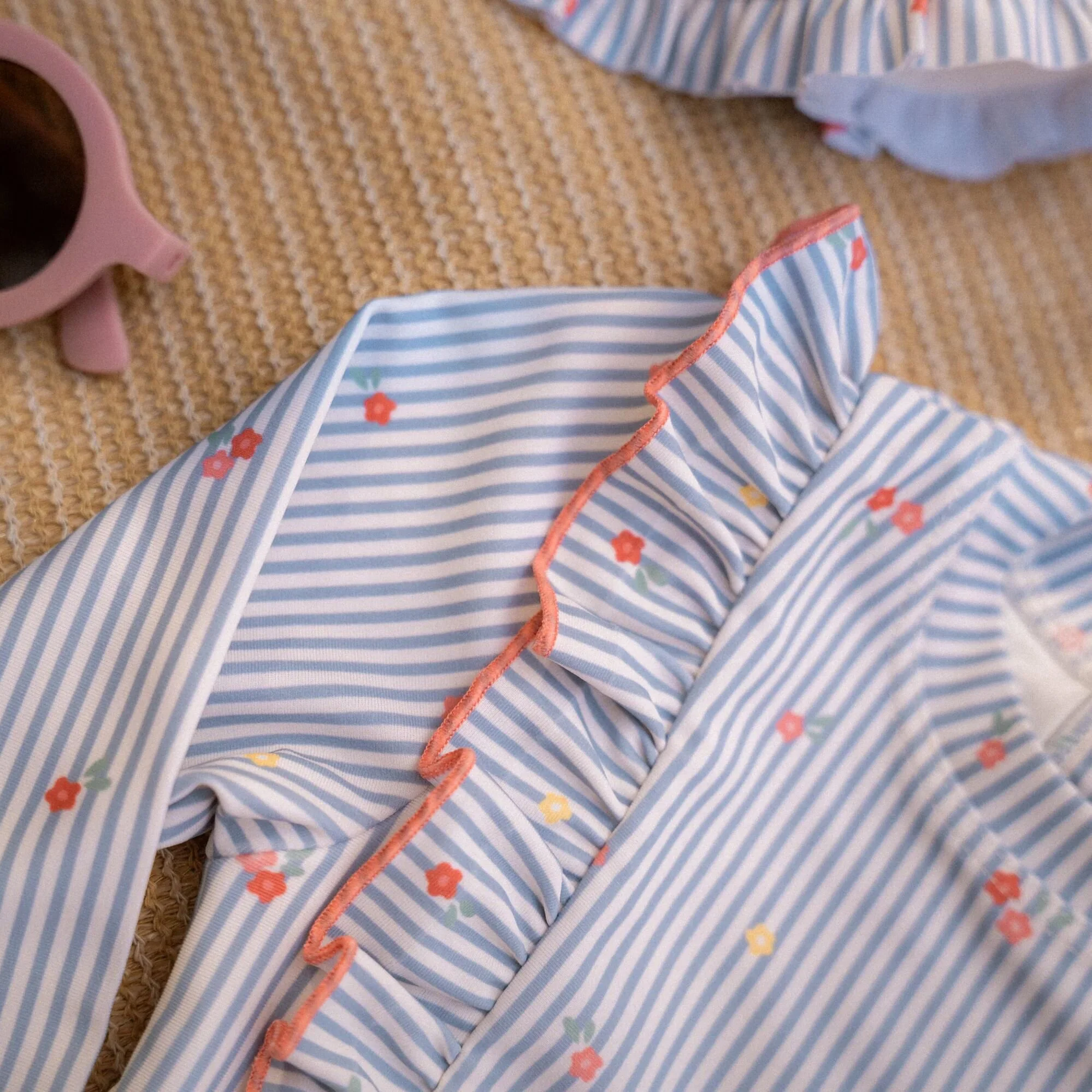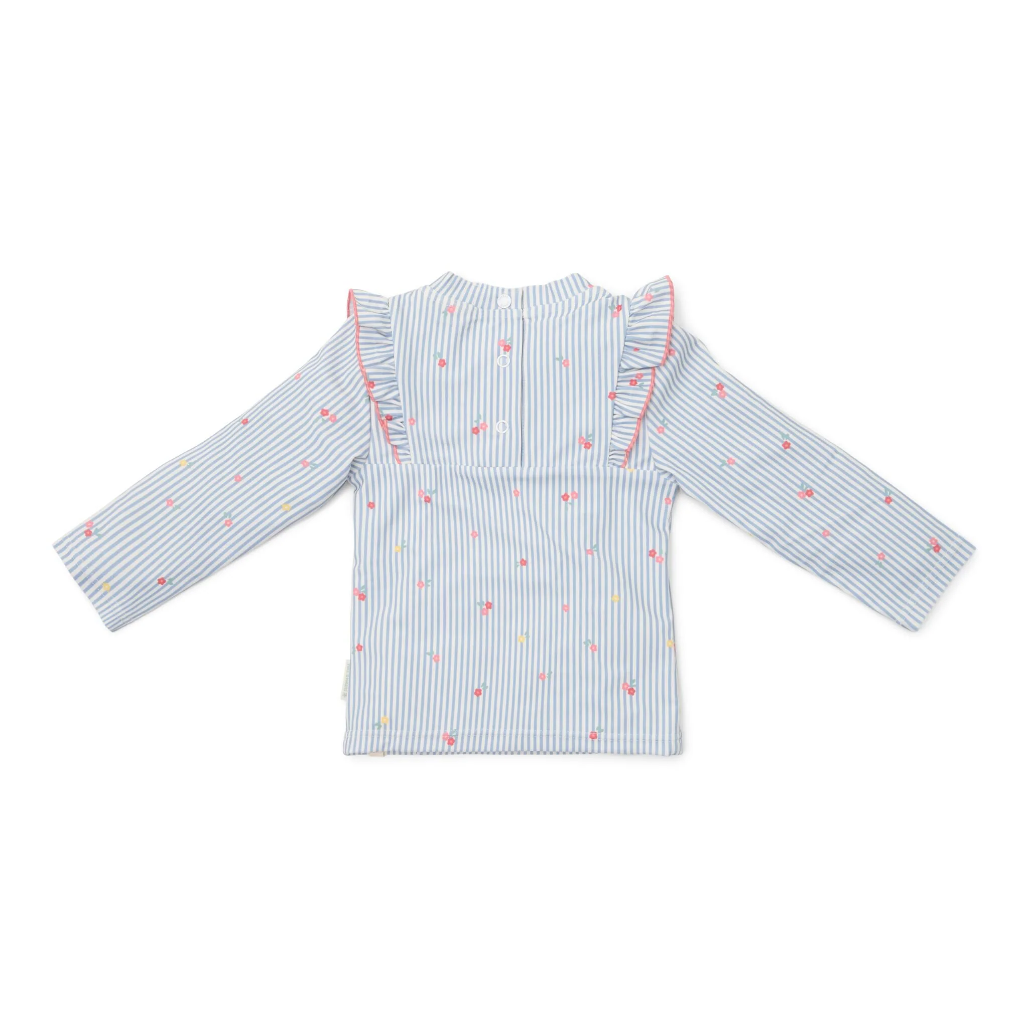 Let’s make a splash in style! This long-sleeved swim shirt keeps you warm in the water and protects you from the sun while you play all day. Whether you love surfing on the water or floating around in a swim ring, this shirt is the perfect choice for summer activities by the coast.This beautiful long-sleeved swim shirt features a fine design of blue and white stripes adorned with small pink flowers. The flowing ruffles provide a romantic look and run from the back to the front. The handy snap closure on the back makes it easy to put on and take off the swim shirt, even when your little one is wet and sandy. This cute swim shirt is available in sizes 62/68, 74/80, 86/92, and 98/104, suitable for every little starfish.Create a coordinated surfer look by pairing it with the matching swim shorts. Don’t forget to always use sunscreen to protect your little one.