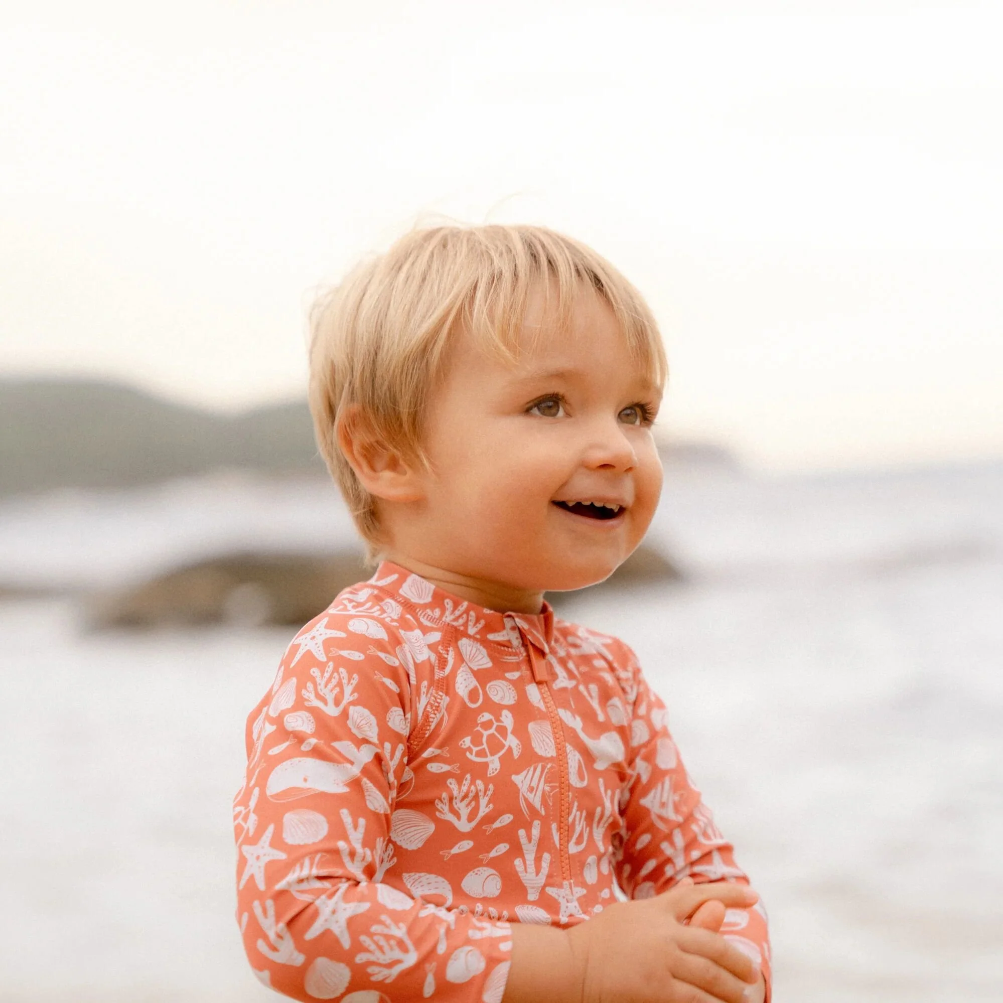Embrace the sunshine and let the adventure begin! Put on your swim shirt and grab your favorite beach toys for a day full of water fun. This swim shirt provides warmth in the water and protects you from the sun, allowing you to play all day long. The stylish coral red swim shirt is adorned with vibrant images of whales, starfish, shells, and coral. Thanks to the comfortable fit, your little surfer will not only enjoy a cool look but also be able to play freely. With a convenient zipper at the back, the shirt is easy to put on and take off, even when your little one is wet and sandy. Available in sizes 62/68, 74/80, 86/92, and 98/104.Complete the look with matching swim trunks and a bucket hat. Don’t forget to always use sunscreen to give your little one extra protection.