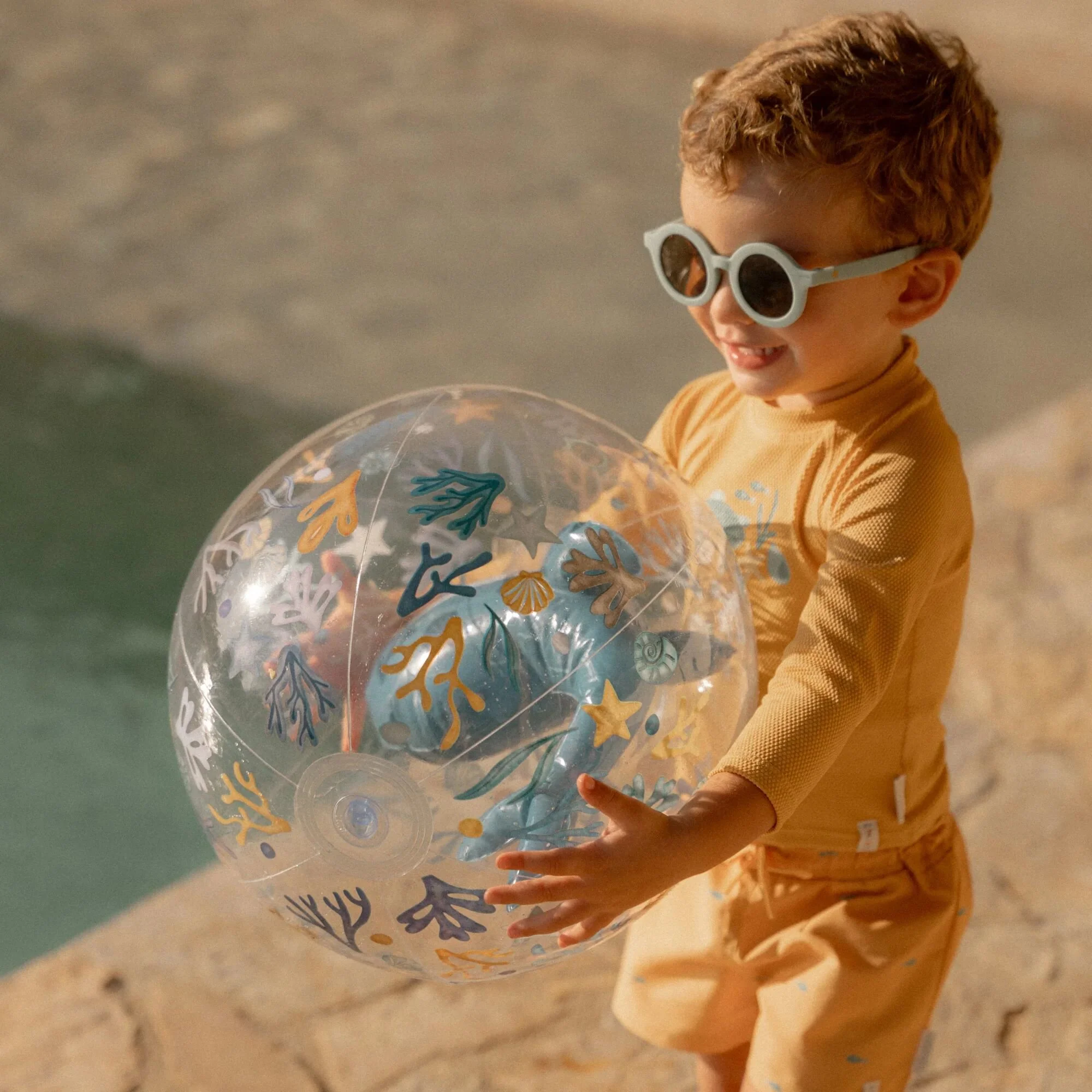 Embrace the sunshine and let the adventure begin! Put on your swim shirt and grab your favorite beach toys for a day full of water fun. This swim shirt provides warmth in the water and protects you from the sun, allowing you to play all day long. The cheerful Sunny Yellow swim shirt features a fun print on the front of a friendly turtle swimming through the coral. Thanks to the comfortable fit, your little surfer will not only enjoy a cool look but also be able to play freely. With a handy zipper at the back, the shirt is easy to put on and take off, even when your little one is wet and sandy. Available in sizes 62/68, 74/80, 86/92, and 98/104.Complete the look with the matching Seashells and Stripes swim shorts and cap. Don’t forget to always use sunscreen to give your little one extra protection.