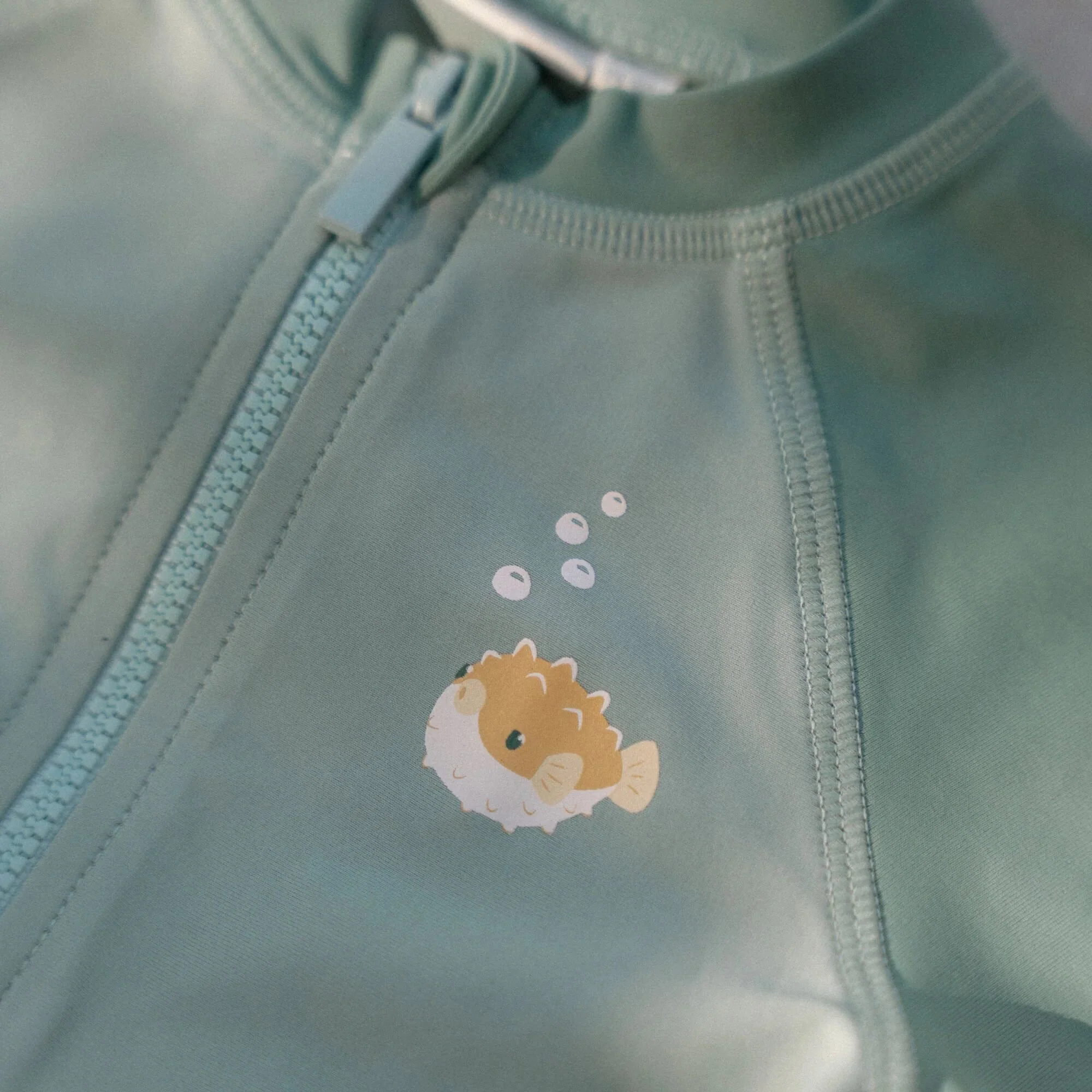 Are you ready for a day of water fun? This short-sleeved swim shirt keeps you warm in the water and protects against the sun, so you can play carefree all day long. Whether you’re surfing the waves or relaxing in a swim ring, this swim shirt is the ideal choice for summer activities at the coast.The short-sleeved swim shirt is carefully crafted and offers a perfect blend of style, functionality, and comfort. The zipper makes it easy to put on and take off the shirt, even when it’s wet. The teal base features a cute little fish on the front, and the sleeves have a slightly darker color. Available in sizes 62/68, 74/80, 86/92, and 98/104.Pair with swim shorts and a swim cap for a complete beach look. Don’t forget to always use sunscreen to protect your little one.
