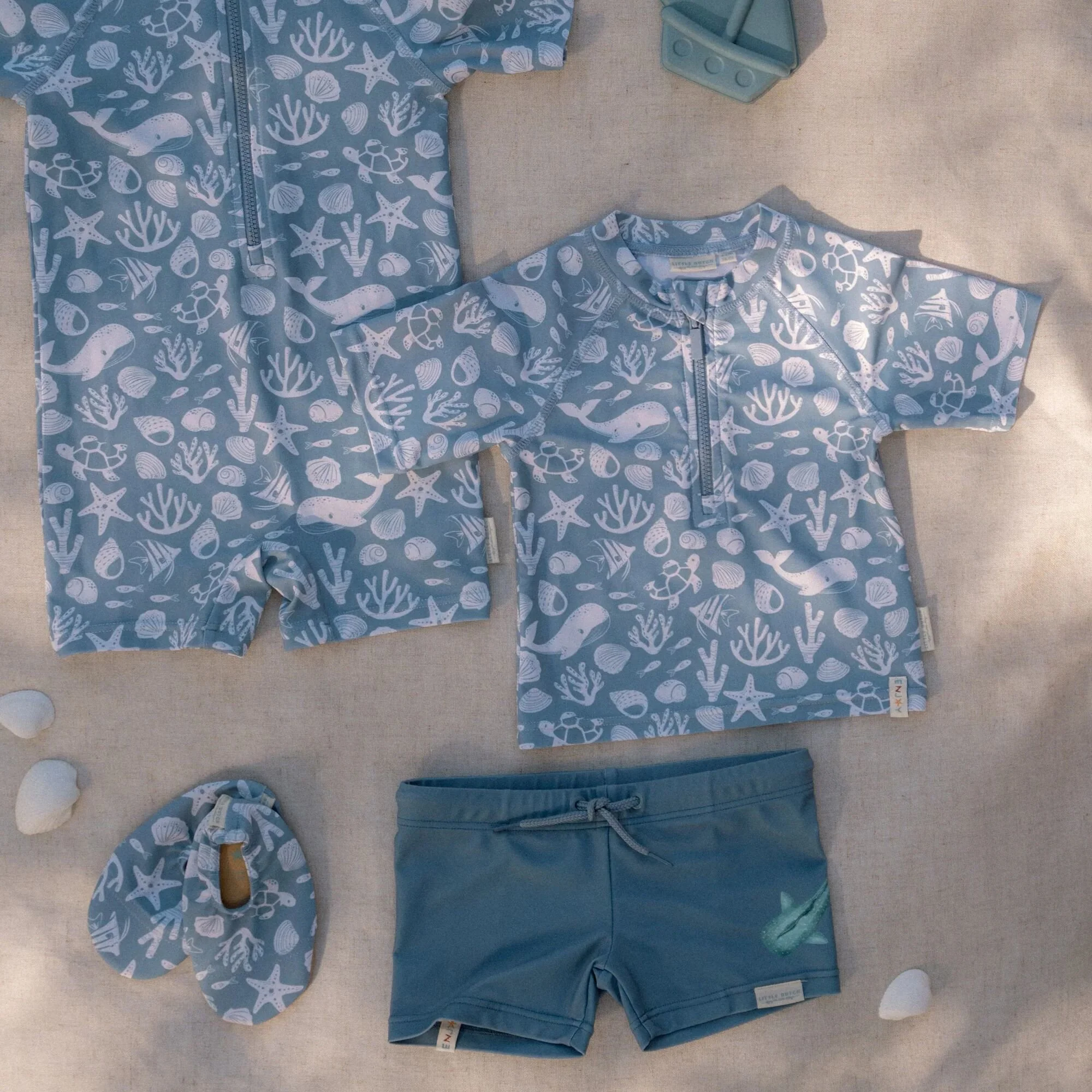 Swim, splash, and play all day long! These comfortable swim trunks ensure that nothing holds you back from fully enjoying the pool or the beach. Go on an adventure and explore the sand and water in search of hidden treasures.These cool swim trunks have an elastic waistband and a drawstring for a comfortable fit, whether your little one is swimming or playing. On the beautiful ocean blue base, you can see a whale swimming along the side. Available in sizes 62/68, 74/80, 86/92, and 98/104.To complete the Ocean Sea Life look, pair the swim trunks with a swim shirt and a bucket hat. Don’t forget to bring a towel and always use sunscreen to ensure maximum protection for your little one.