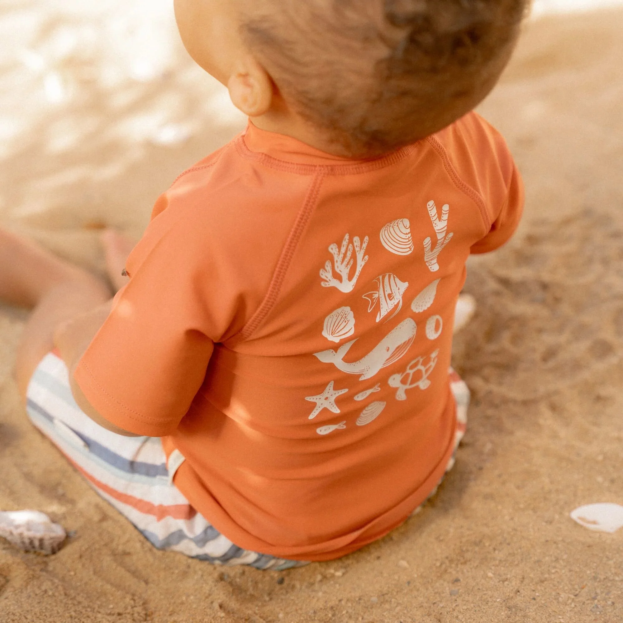 Dive into a world of fun! In these swim shorts, the beach or pool transforms into an adventurous playground, and every jump brings you closer to discovering the fascinating wonders of the water.The striking striped pattern, accented by a blue pocket at the back, adds a playful flair to these sturdy swim trunks. The wide fit and elastic waistband with drawstring ensure lasting comfort both in and out of the water. Available in sizes 62/68, 74/80, 86/92, and 98/104.From giggling in the toddler pool to building sandcastles on the beach, these swim shorts are suitable for every moment. Let your little one experience the magic of water in style and comfort!Complete the Ocean Sea Life look with a swim shirt and matching bucket hat. Don’t forget to bring a towel and always use sunscreen to provide your little one with maximum protection.
