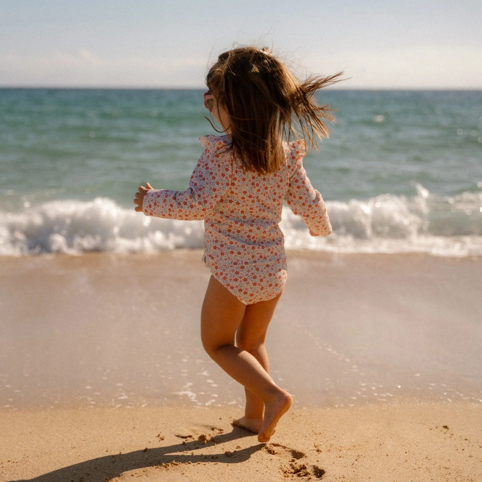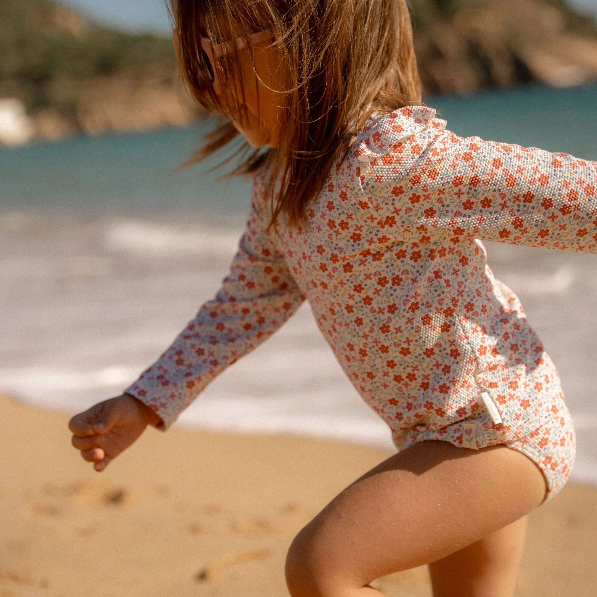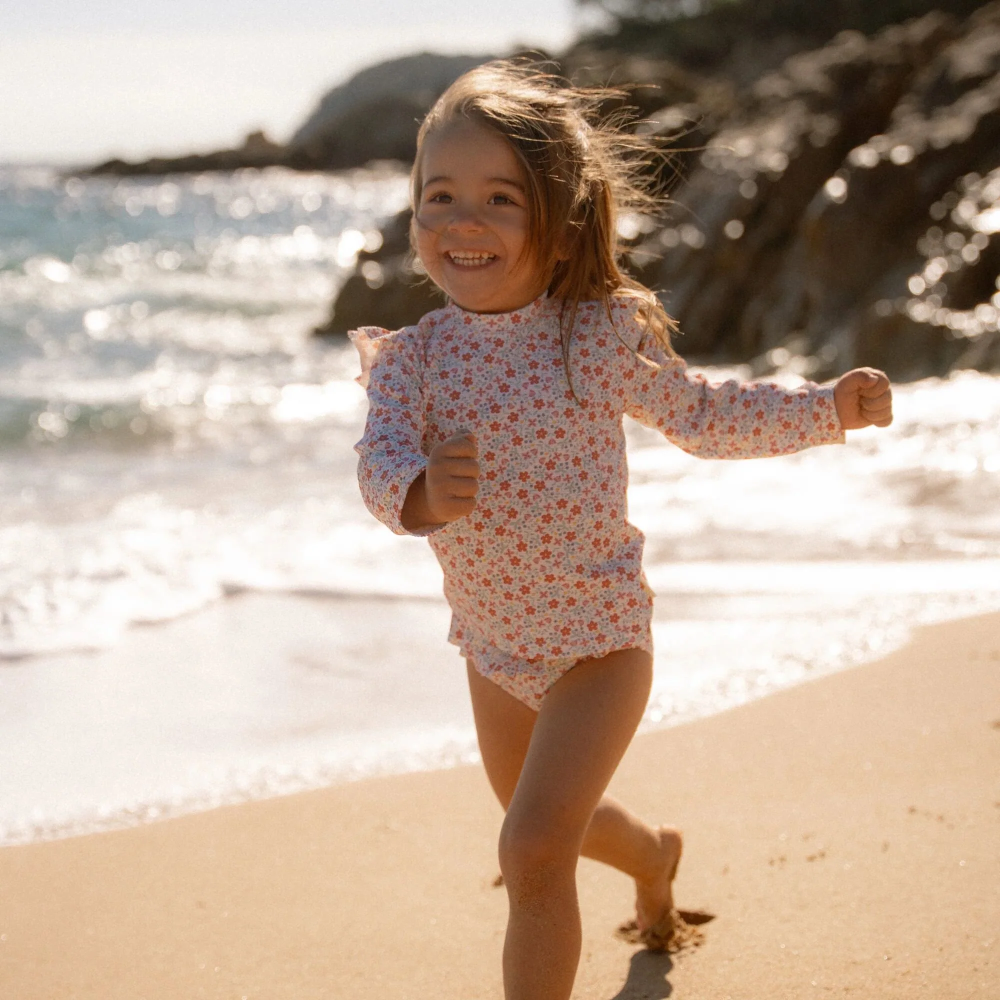 Dive into the adventure and enjoy the refreshing water! Whether it’s the pool or the sea, let the water be your playground. This swim trunk ensures comfort with every movement, whether you’re swimming or playing.The Sunny Flowers swim trunk makes the summer days by the water even sunnier. It features a lovely print of small pink flowers intertwined with branches full of green leaves. The charming ruffles along the waist dance with every movement your little one makes while playing in the water. Available in sizes 62/68, 74/80, 86/92, and 98/104.Pair the swim trunk with a swim shirt for extra protection on sunny days. Don’t forget to always use sunscreen to protect your little one.
