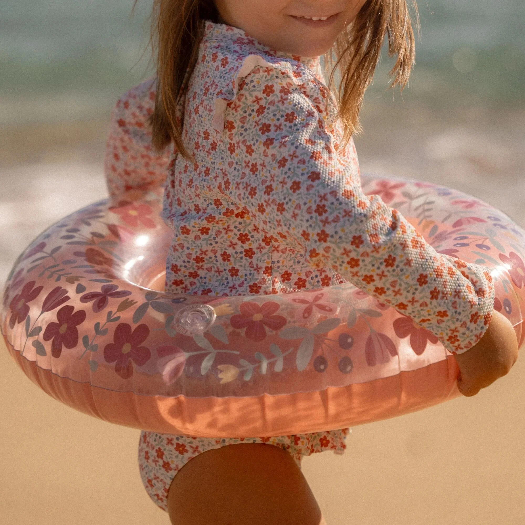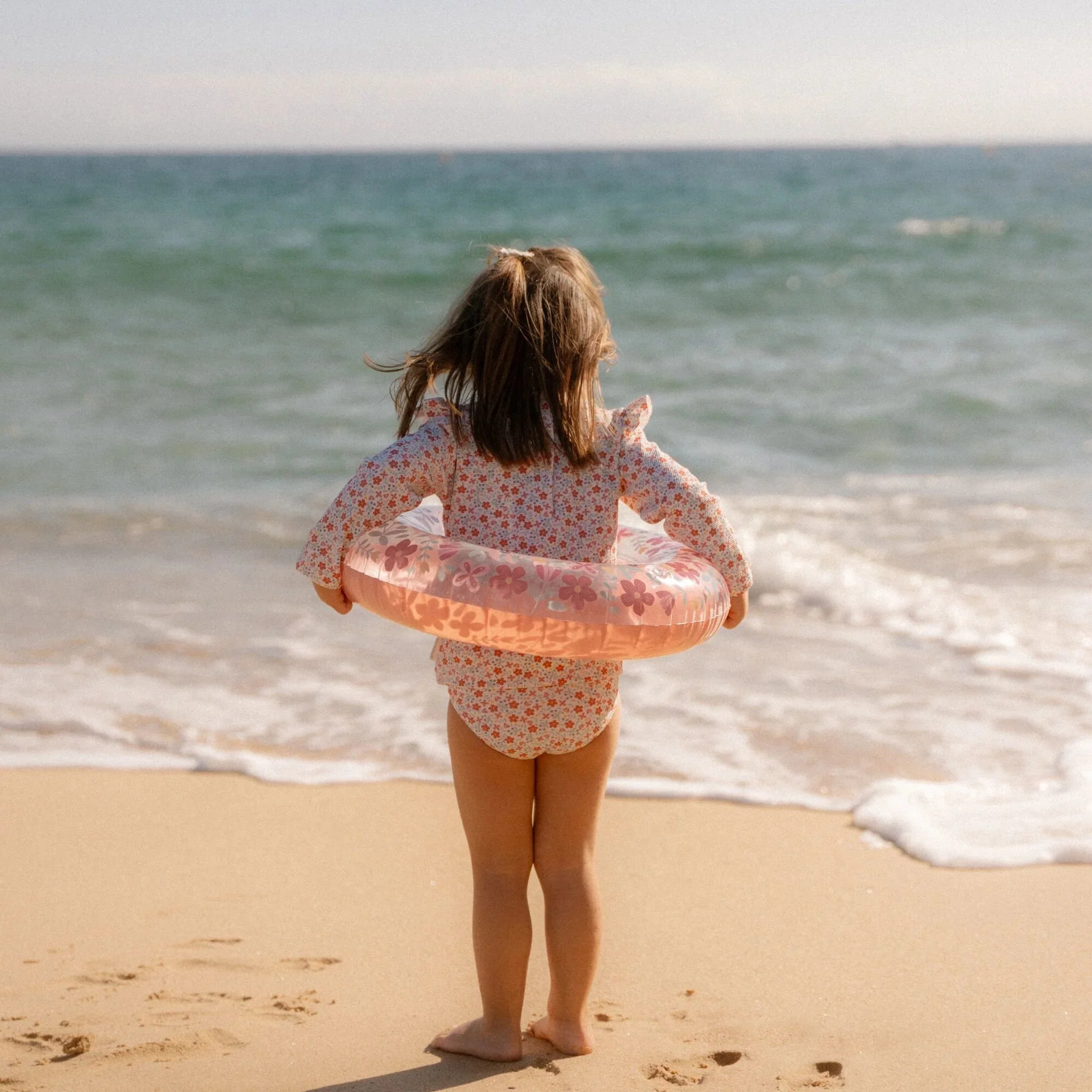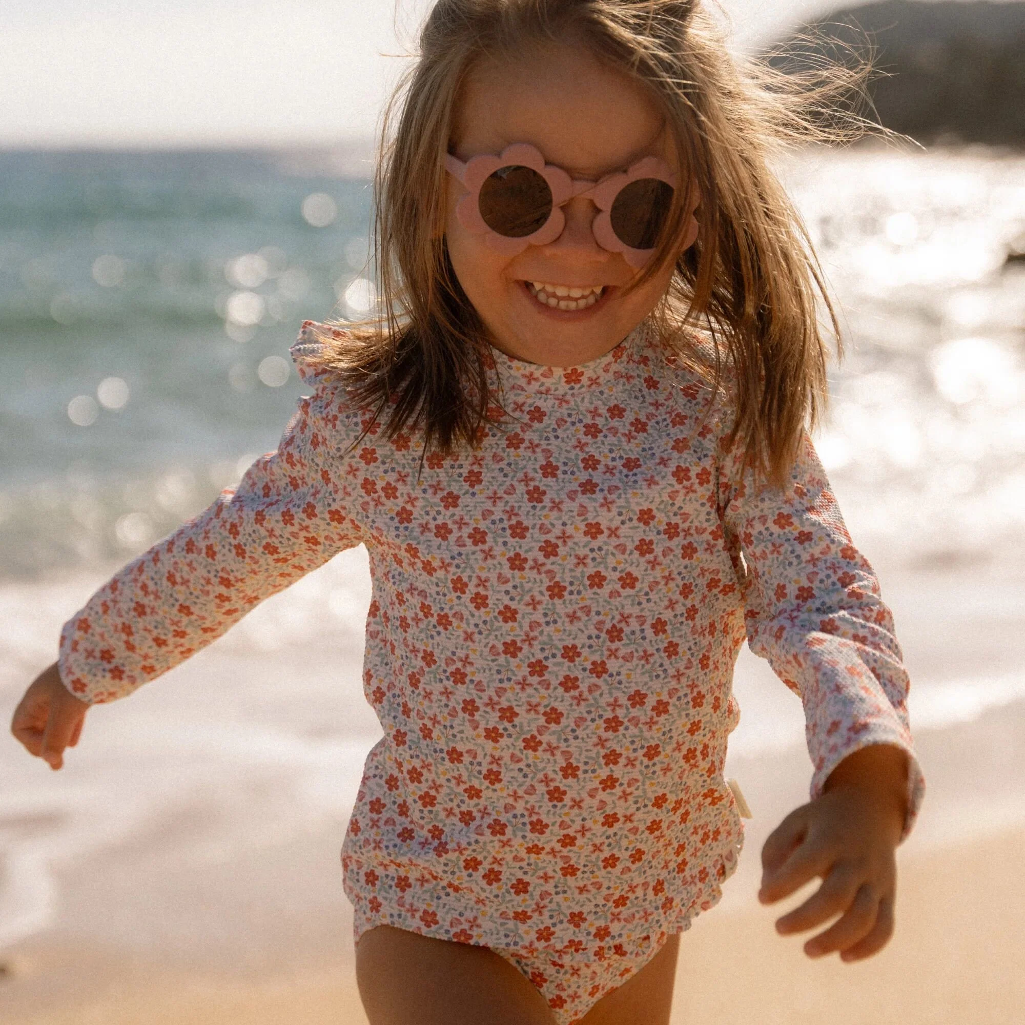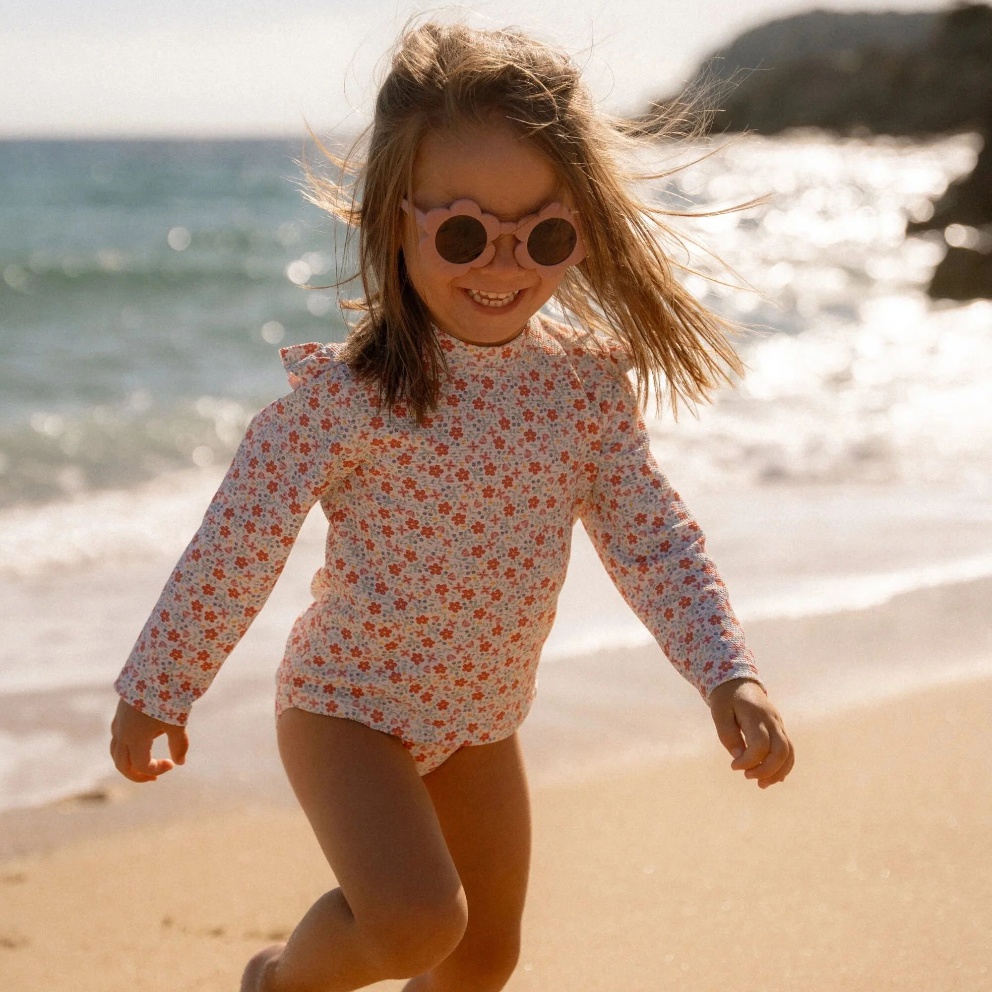 Dive into the adventure and enjoy the refreshing water! Whether it’s the pool or the sea, let the water be your playground. This swim trunk ensures comfort with every movement, whether you’re swimming or playing.The Sunny Flowers swim trunk makes the summer days by the water even sunnier. It features a lovely print of small pink flowers intertwined with branches full of green leaves. The charming ruffles along the waist dance with every movement your little one makes while playing in the water. Available in sizes 62/68, 74/80, 86/92, and 98/104.Pair the swim trunk with a swim shirt for extra protection on sunny days. Don’t forget to always use sunscreen to protect your little one.