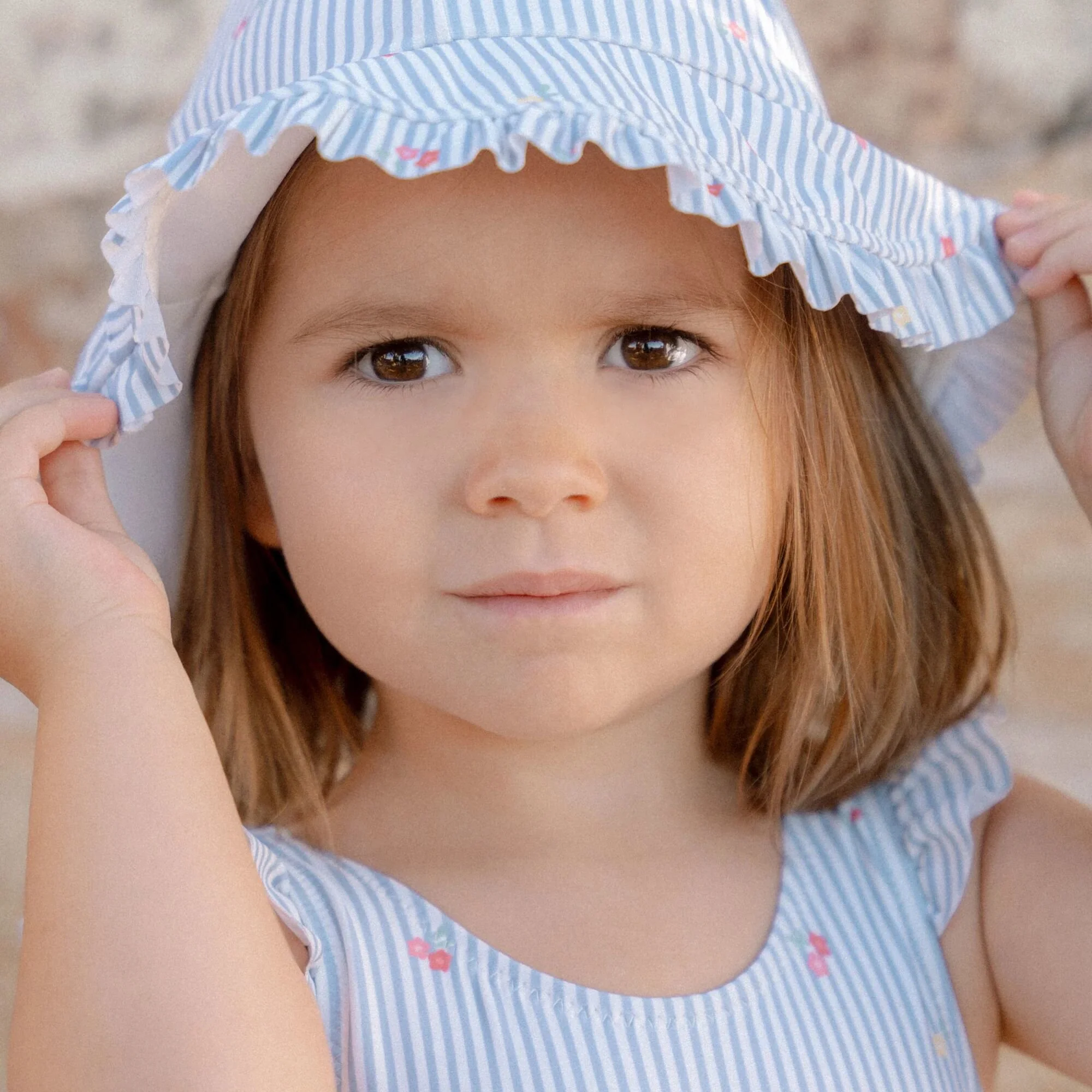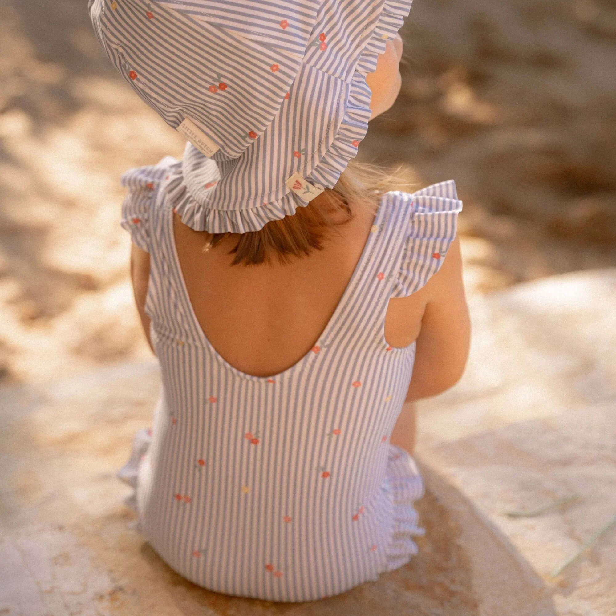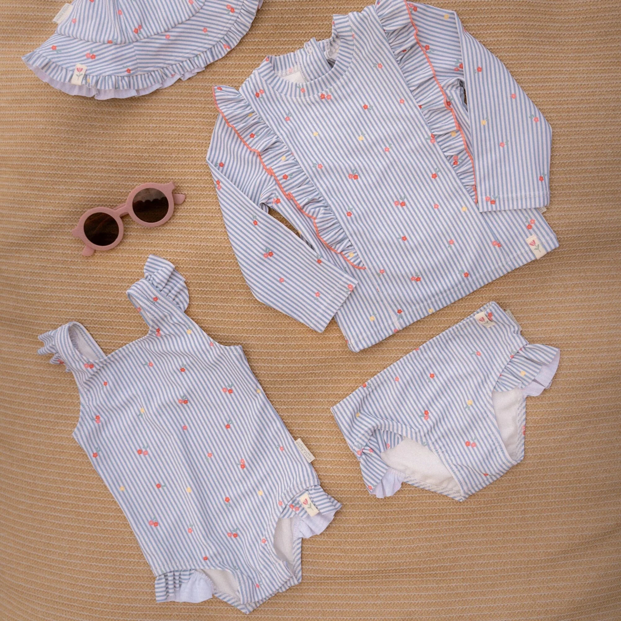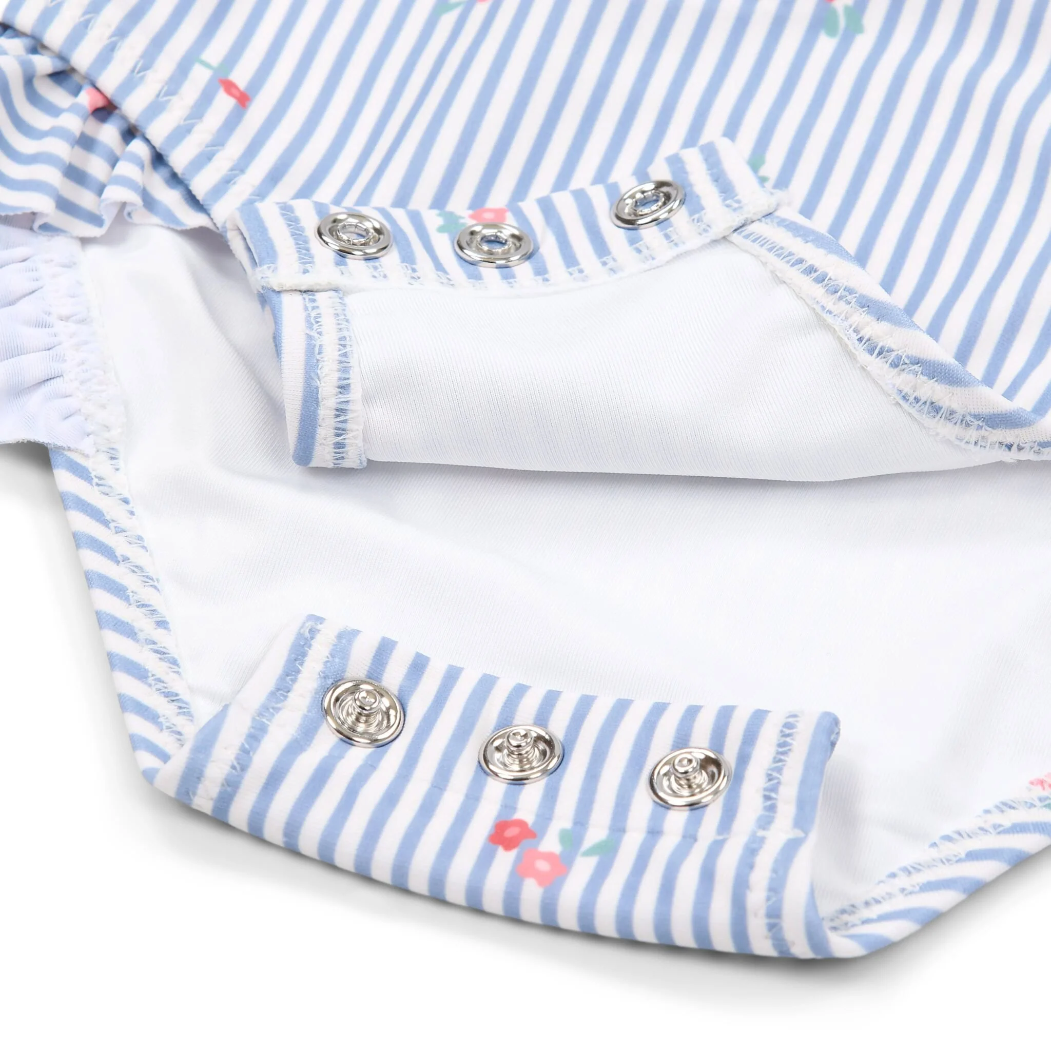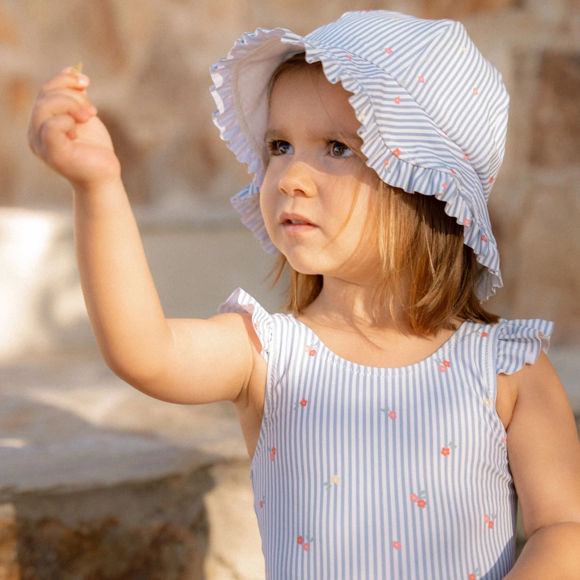 Feel the sand between your toes – it’s time for the beach! Whether you’re playing in the waves or building sandcastles, this swimsuit is sure to impress and create beautiful memories of sunny days by the sea.This lovely swimsuit features a fine design of blue and white stripes adorned with small pink flowers. The cute ruffles on the shoulders and at the bottom give it an extra playful and adorable touch. The swimsuit is available in four sizes. The two smaller sizes, 62/68 and 74/80, have convenient snap buttons at the crotch so you can easily change a diaper.Pair with a sun hat for a complete Sunny Flowers look. Don’t forget to always use sunscreen to protect your little one.