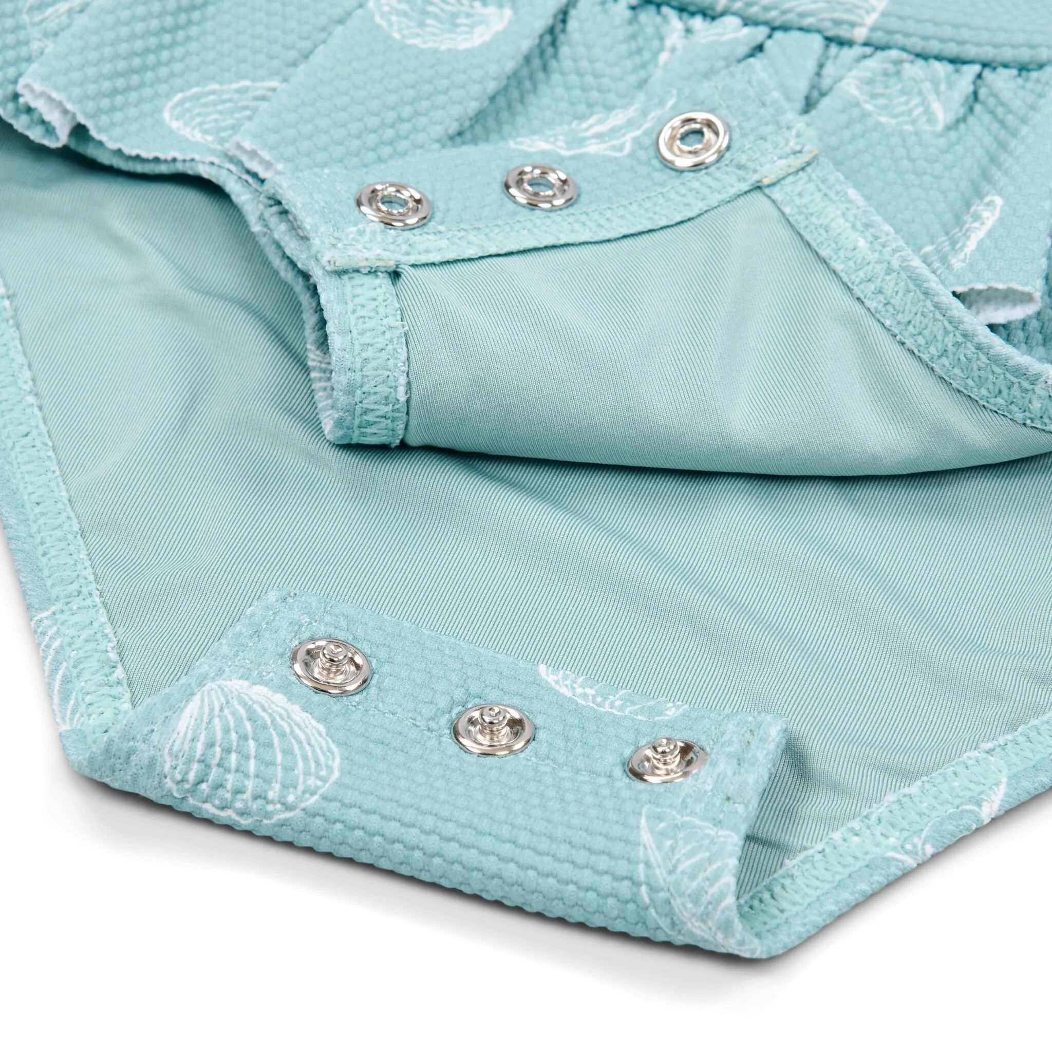 Off to the waves! With this beautiful swimsuit, you’ll make a splash as the cutest surfer girl on the beach. So grab your longboard and let’s head to the coast.This cute long-sleeved swimsuit features a lovely mint green base adorned with a charming print of white shells, creating an imaginative look. The ruffles on the shoulders and the charming ruffled skirt give the swimsuit a cute and playful appearance. The handy snap closure on the back makes it easy to put on and take off, even when your little one is wet and sandy.The swimsuit is available in four sizes. The two smaller sizes, 62/68 and 74/80, have convenient snaps in the crotch so you can easily change a diaper.Pair with the matching sun hat for protection against the sun’s rays. And don’t forget to always use sunscreen to protect your little one.