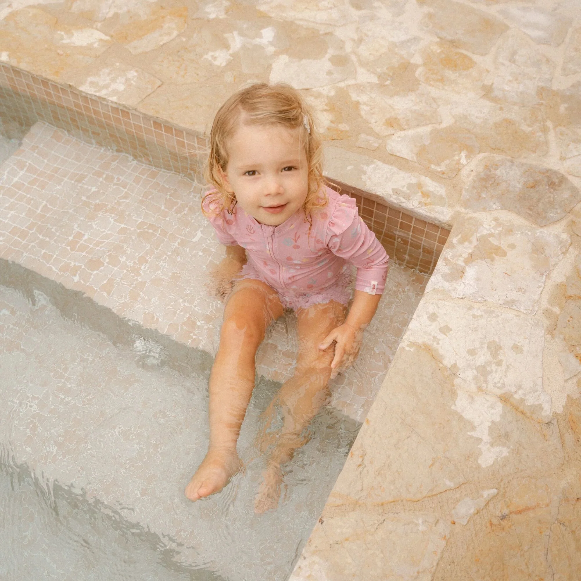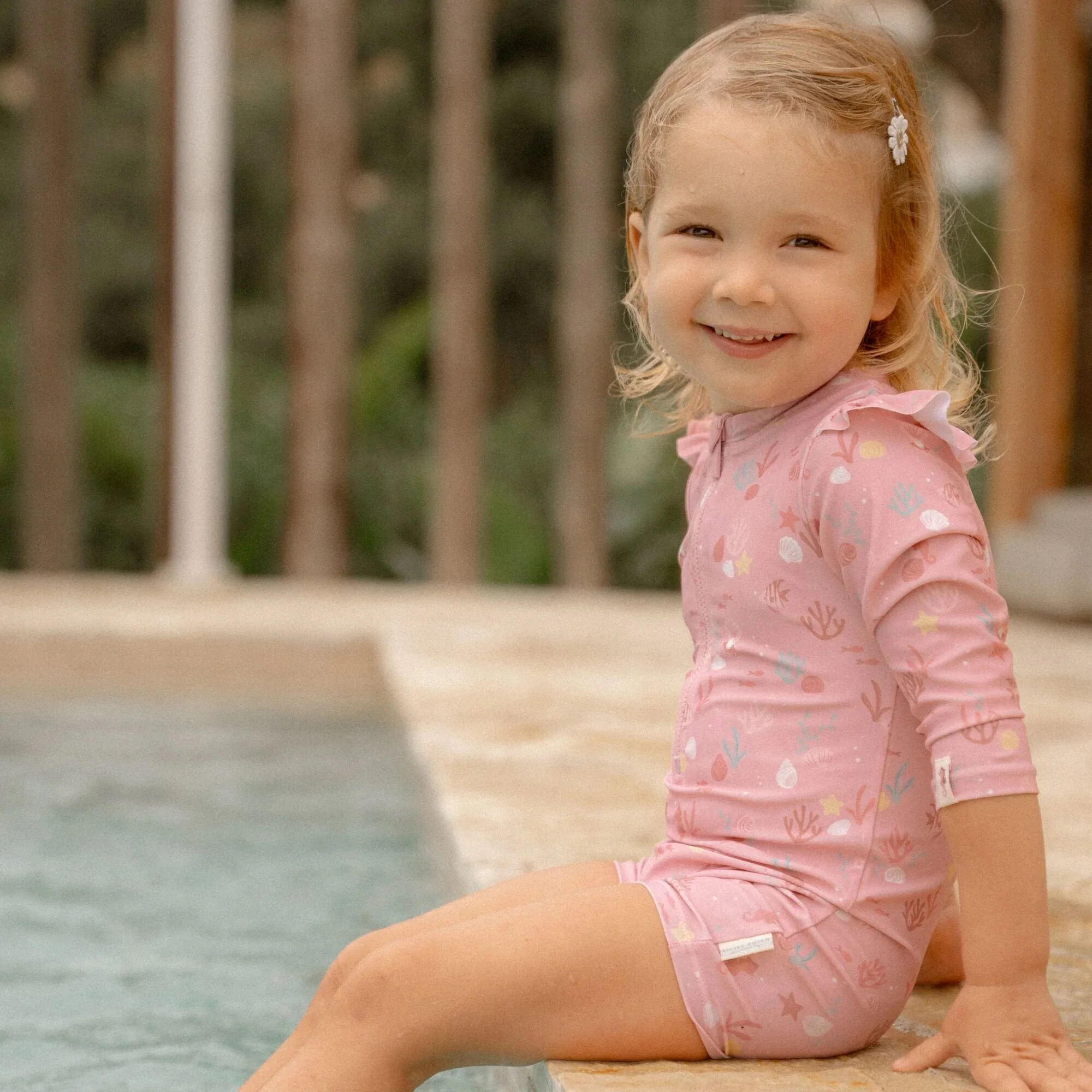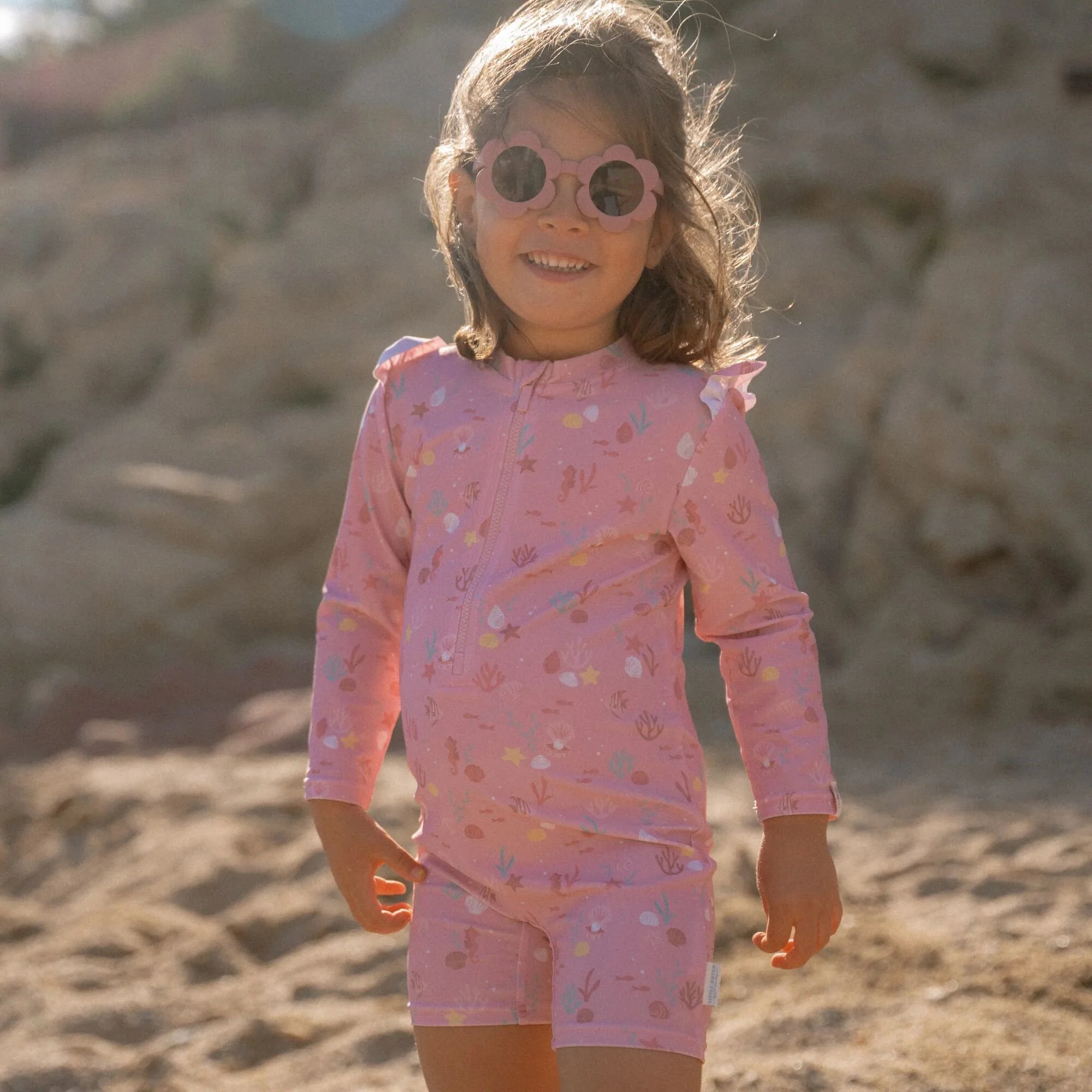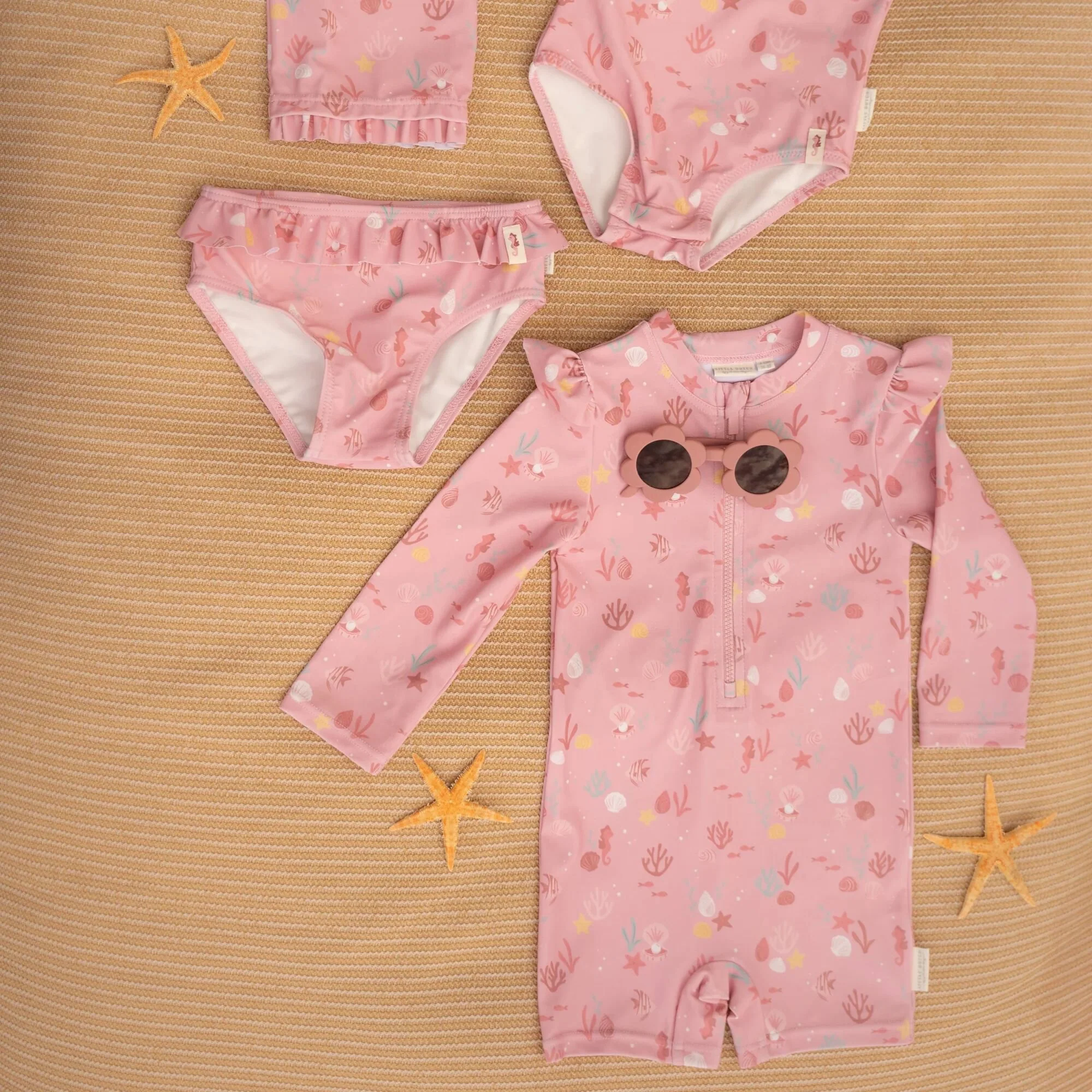 Dive into summer with this cute swimsuit featuring the charming Ocean Treasures design. It has a beautiful light pink color adorned with seahorses, coral, and shells, creating a stunning underwater theme. It’s perfect for a day at the beach or by the pool, combining comfort with elegance and playful ruffles on the shoulders, so your little girl shines in style.Thanks to the long sleeves, your child is well protected from the sun’s rays, allowing you to enjoy hours of beach fun without worry. The front zipper ensures easy on and off, even when your child is wet and sandy. Available in sizes 62/68, 74/80, 86/92, and 98/104.For optimal protection, you can pair this swimsuit with a matching swim cap and swim shoes. Together they form the ideal set, both stylish and protective, allowing you to let your child play on the beach with peace of mind. Don’t forget to always use sunscreen to give your little one extra protection.