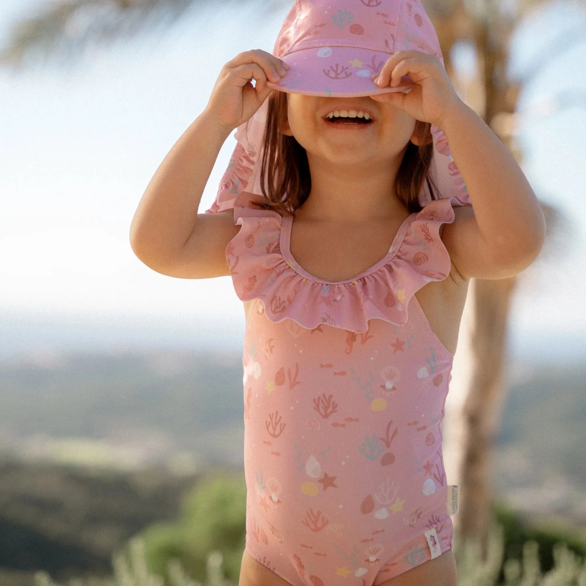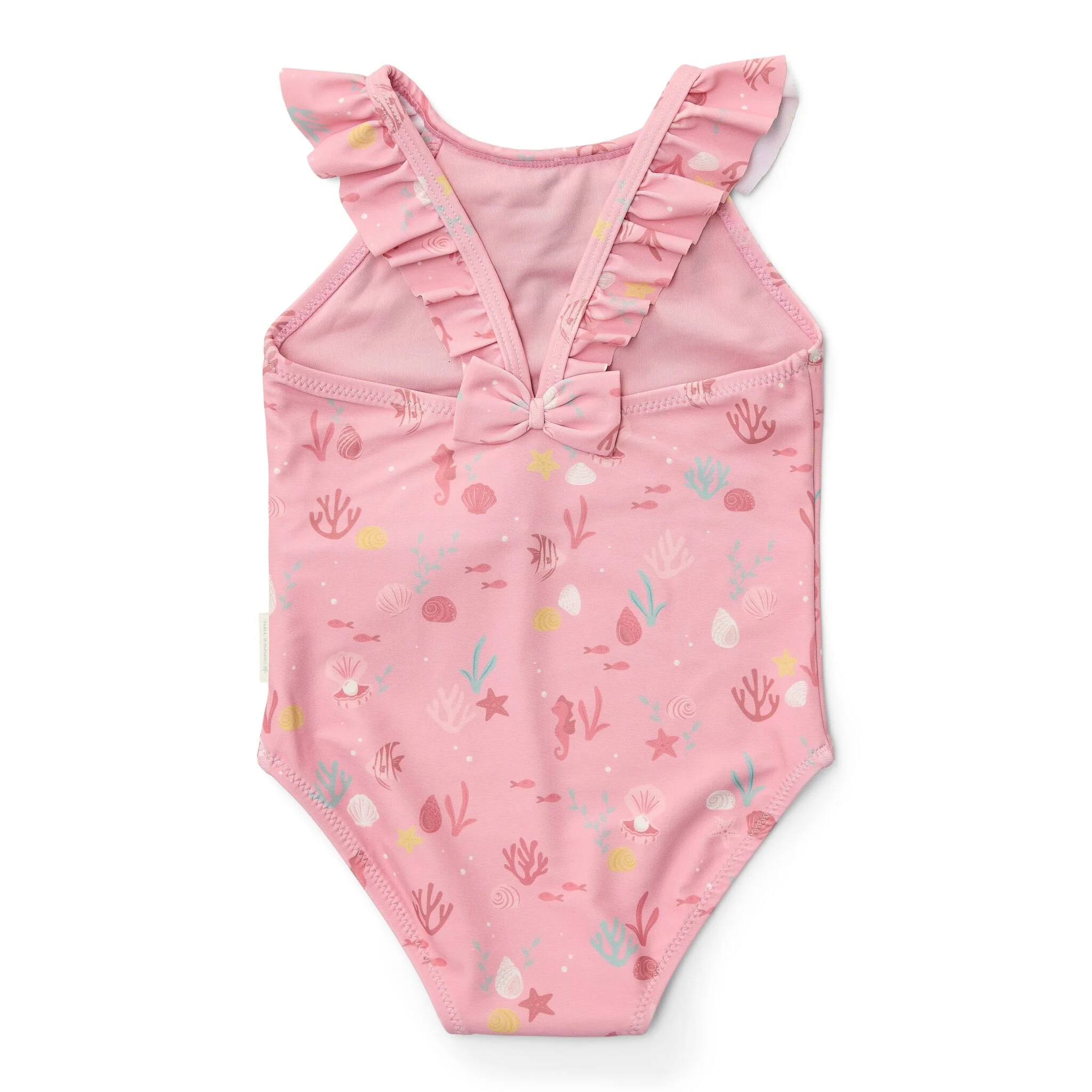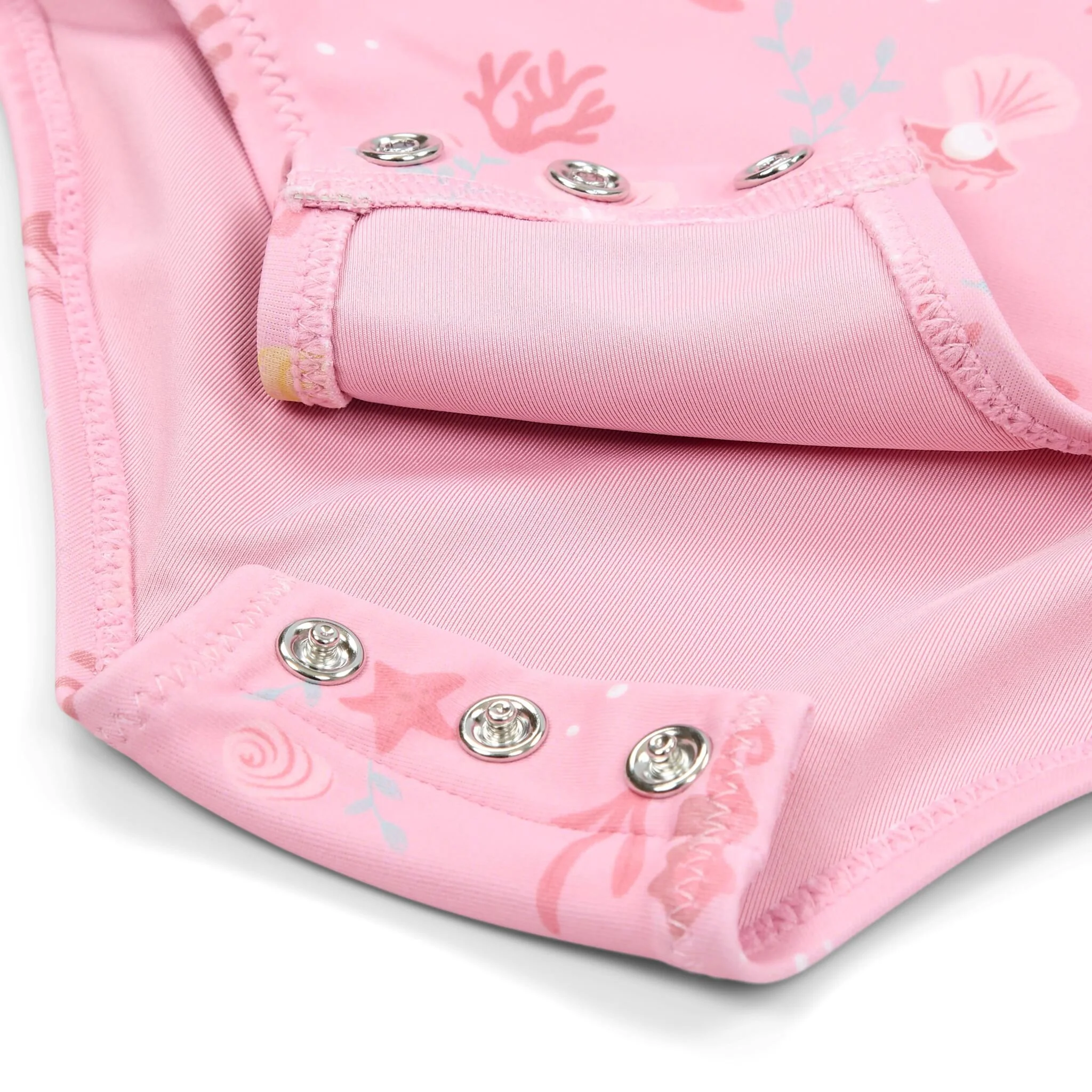 Let’s take a refreshing dip! Whether it’s in the rolling sea or in the clear pool water, with this swimsuit you’ll make a splashy impression.The Sunny Flowers swimsuit has a sweet light pink color adorned with seahorses, coral, and shells, creating a beautiful underwater theme. The ruffles on the shoulder straps provide a playful and cute appearance. The swimsuit is available in four sizes. The two smaller sizes, 62/68 and 74/80, have convenient snap buttons in the crotch so you can easily change a diaper.Pair with the matching swim cap for an Ocean Treasures look from head to toe. Don’t forget to always use sunscreen to protect your little one.