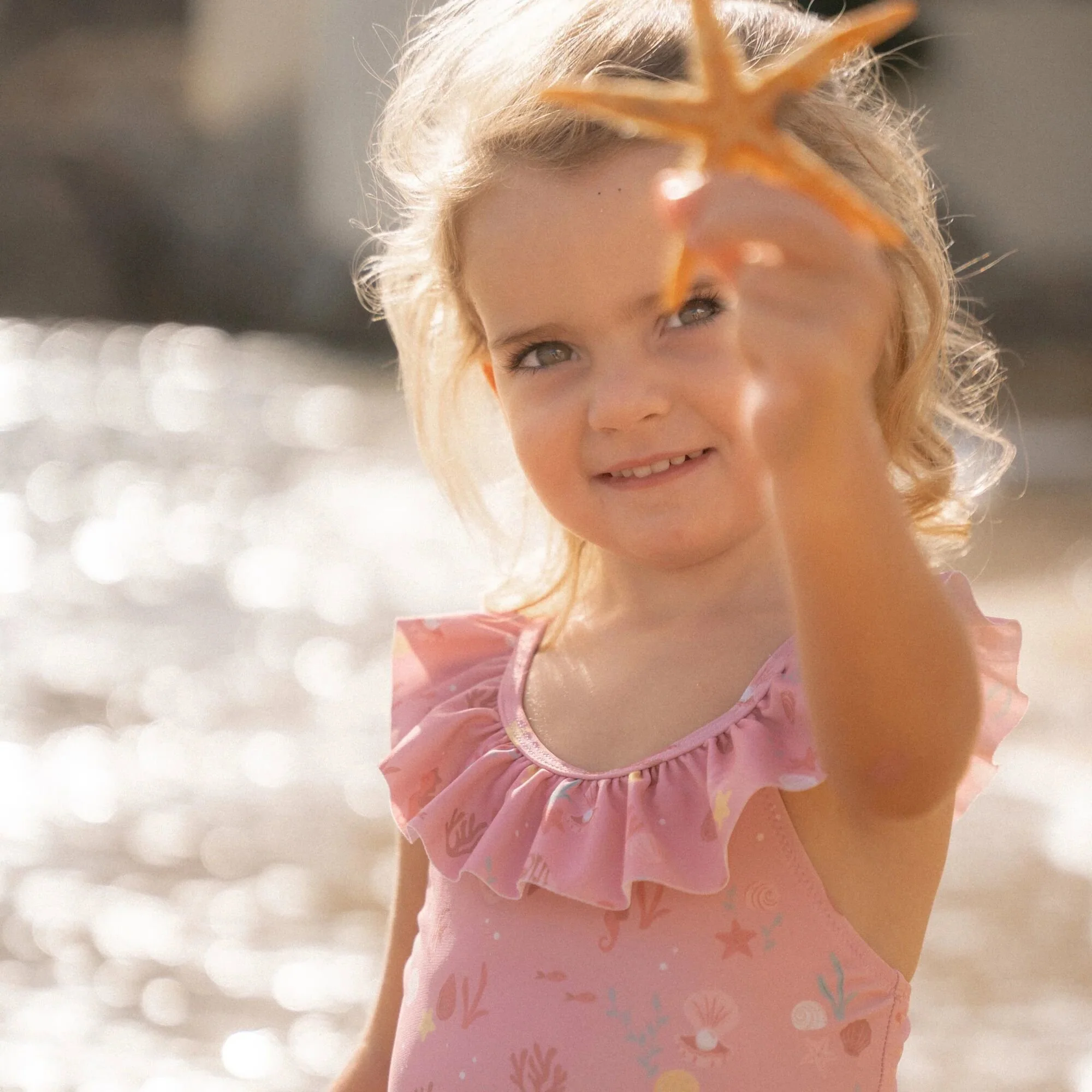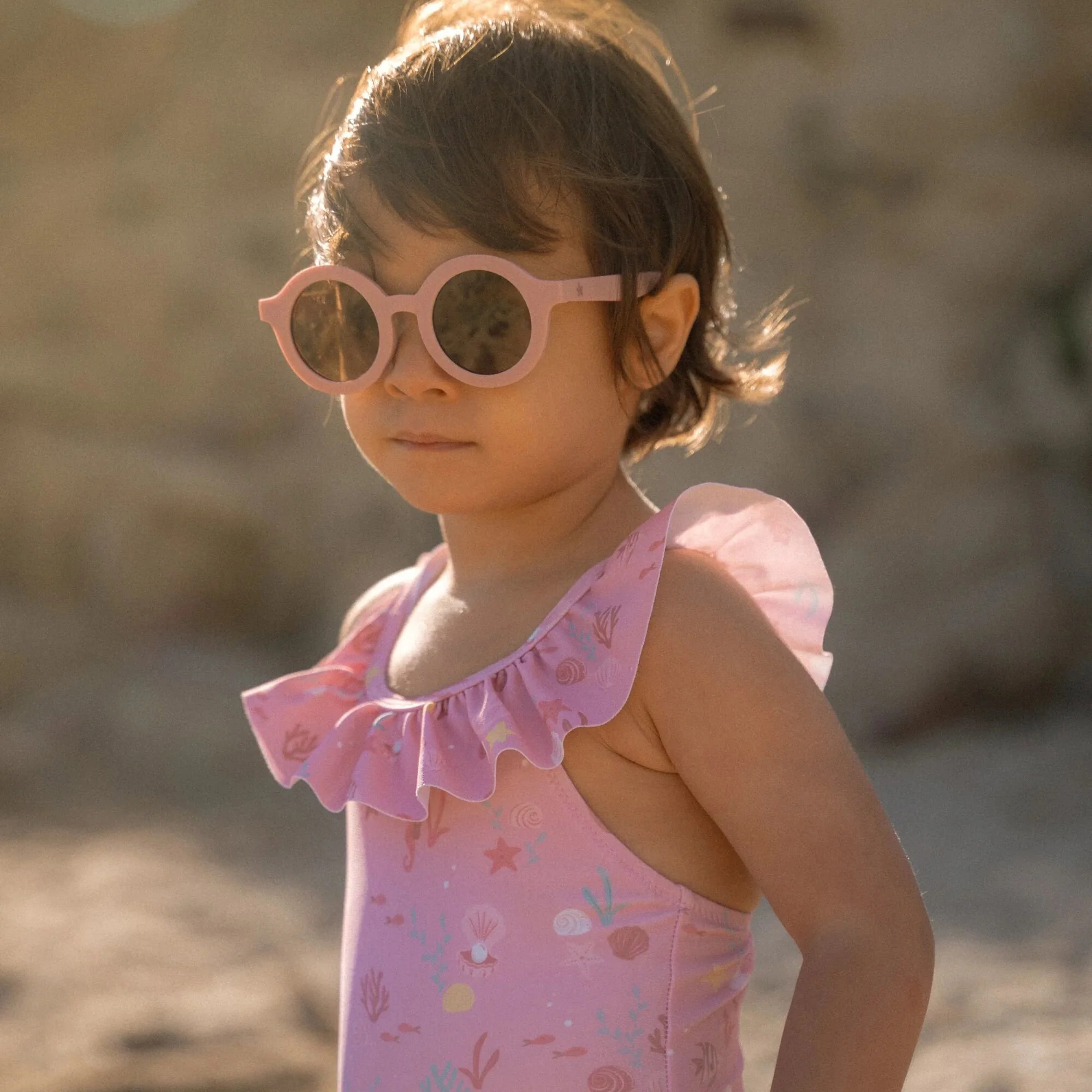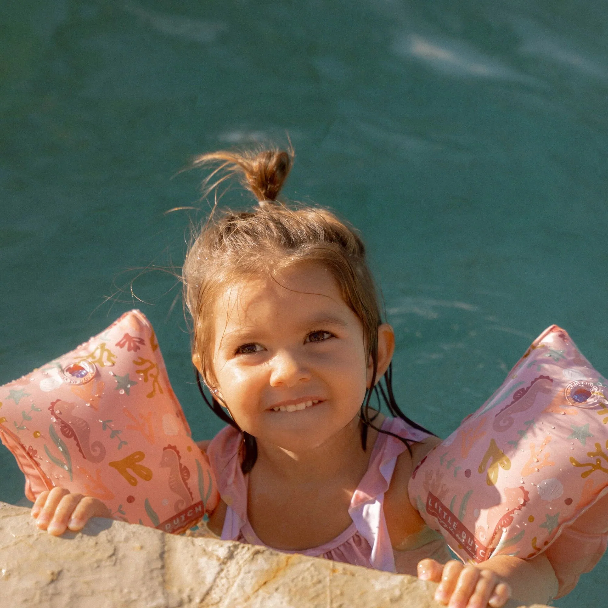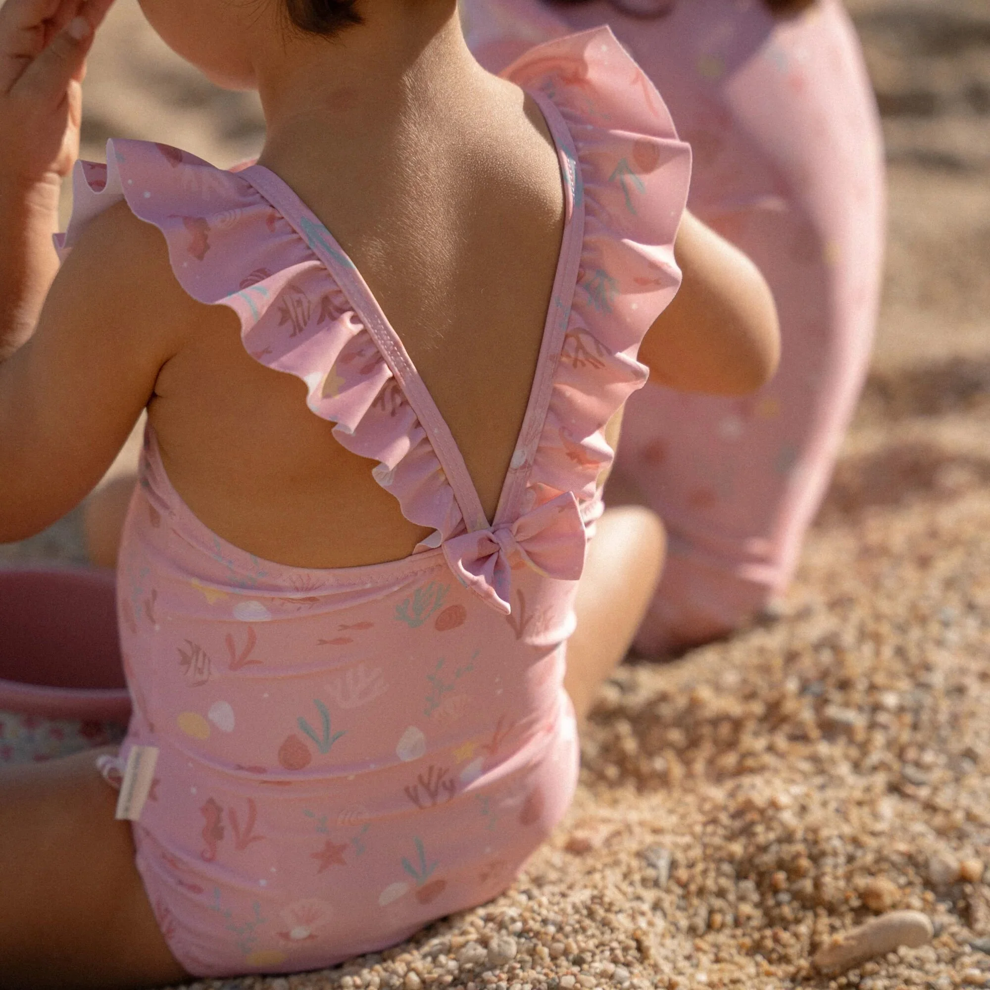 Let’s take a refreshing dip! Whether it’s in the rolling sea or in the clear pool water, with this swimsuit you’ll make a splashy impression.The Sunny Flowers swimsuit has a sweet light pink color adorned with seahorses, coral, and shells, creating a beautiful underwater theme. The ruffles on the shoulder straps provide a playful and cute appearance. The swimsuit is available in four sizes. The two smaller sizes, 62/68 and 74/80, have convenient snap buttons in the crotch so you can easily change a diaper.Pair with the matching swim cap for an Ocean Treasures look from head to toe. Don’t forget to always use sunscreen to protect your little one.