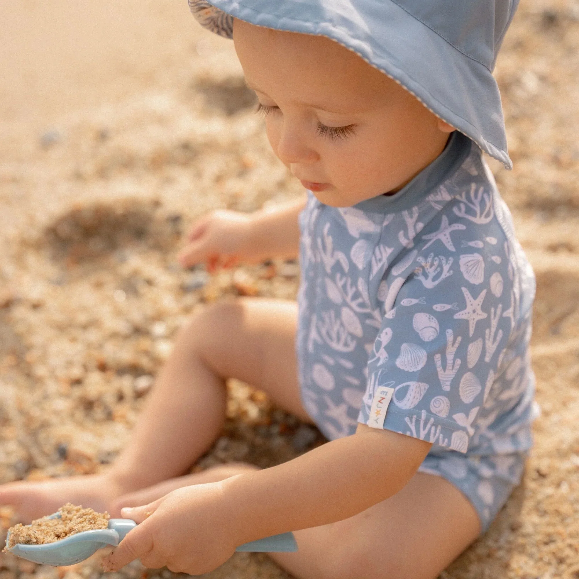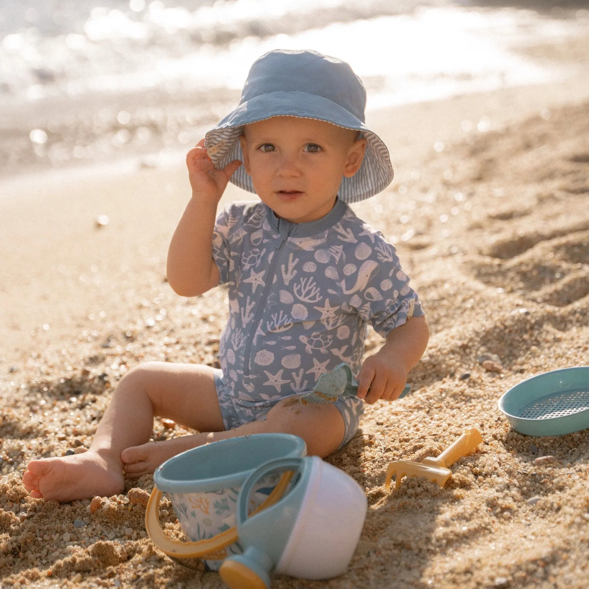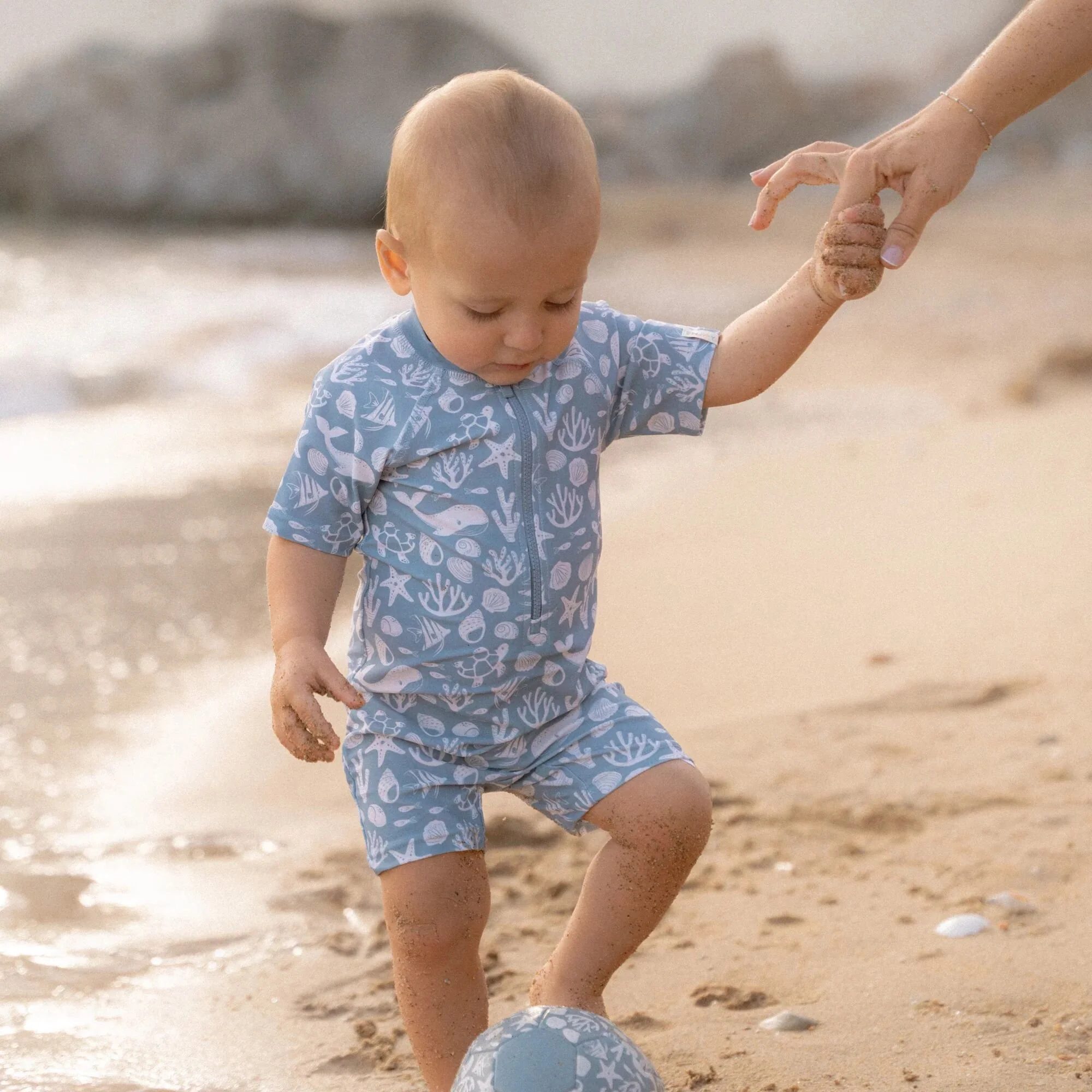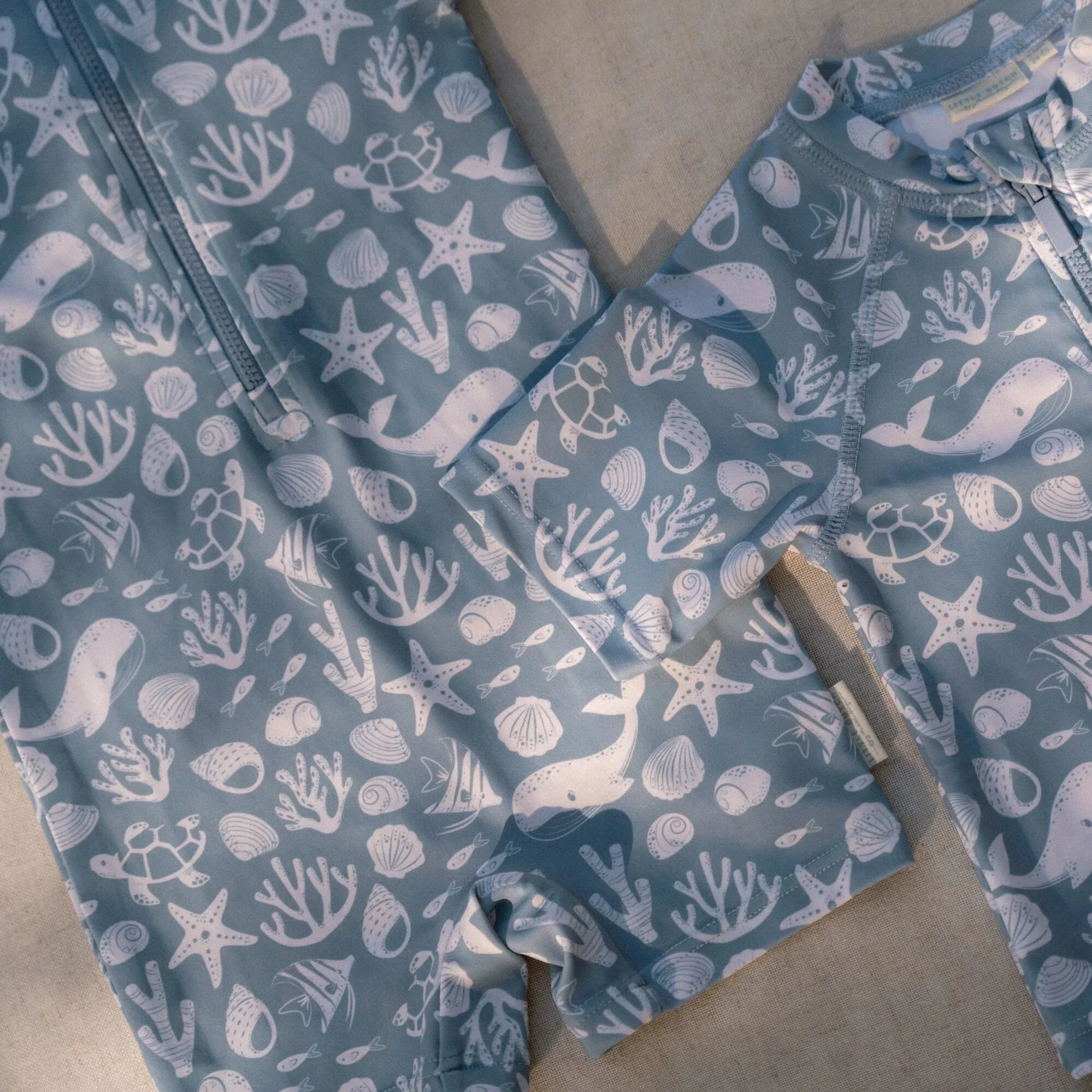 Get ready for high waves and good vibes with this short-sleeved swimsuit, designed for a whole day of sun and water fun. Whether you love the waves or building sandcastles, with this suit you’ll look like the coolest surfer on the beach.This short-sleeved swimsuit keeps your little one warm in the water and protects against the sun. The Sea Life design, adorned with whales on an ocean blue background, makes water activities even more fun.The front zipper ensures easy on and off, even when your child is wet and sandy. Made from recycled polyester, this swimsuit is available in sizes 62/68, 74/80, 86/92, and 98/104.Complete the look by pairing the swimsuit with a bucket hat and matching swim shoes. And don’t forget to always use sunscreen to protect your little one.