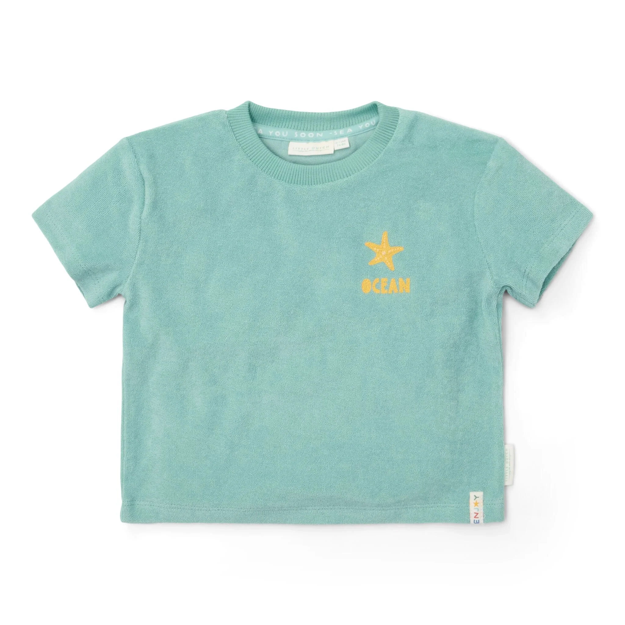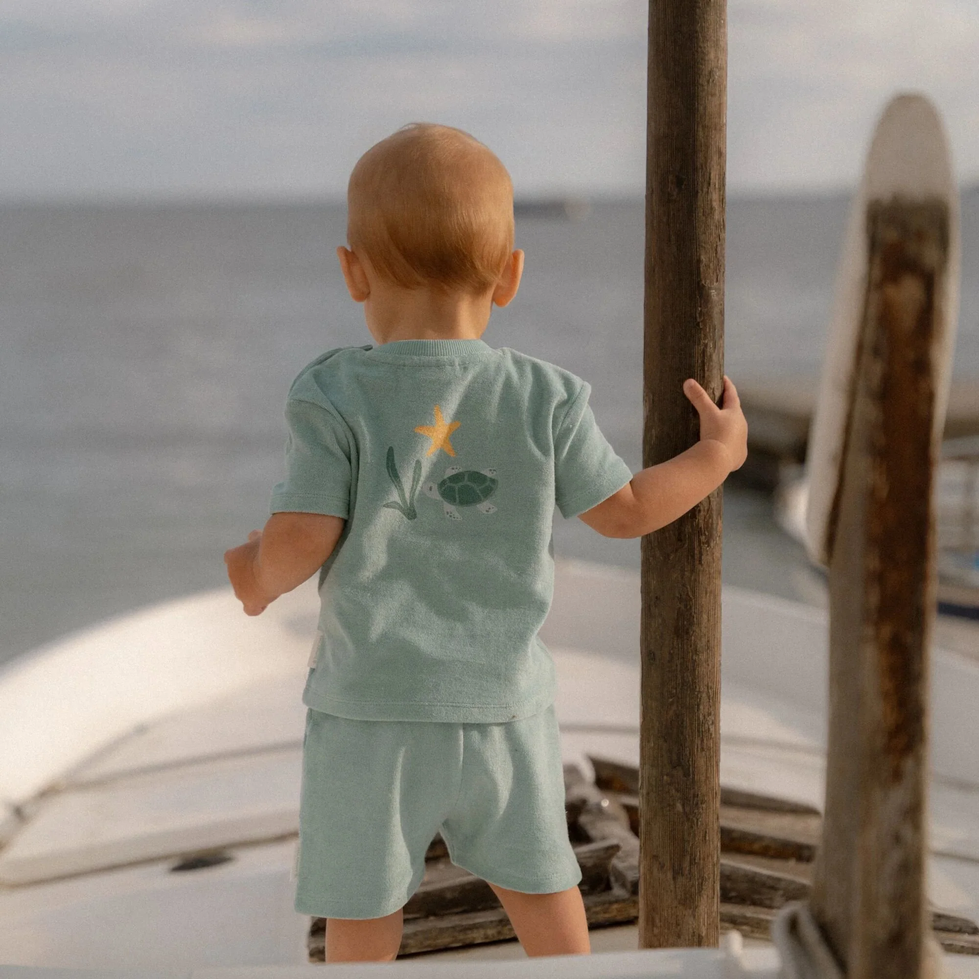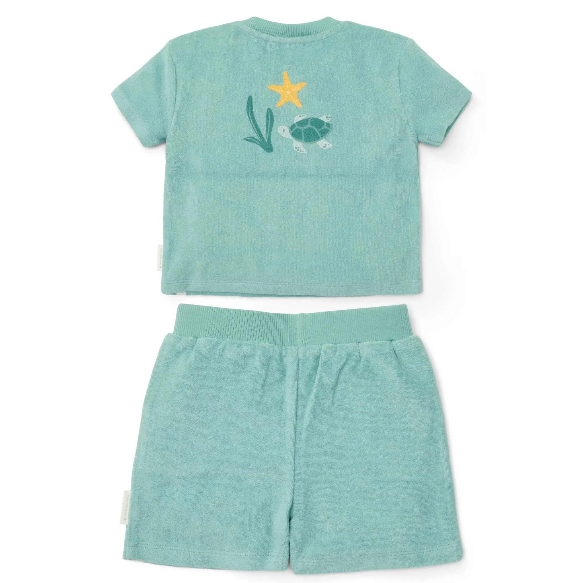 Enjoy the summer with our T-shirt and shorts set from the Seashells and Stripes collection in the color Surf Blue. Made from 100% organic cotton in soft terry cloth, this set offers ultimate comfort after swimming or on sunny days. The back of the T-shirt is adorned with a print of iconic sea creatures, giving it a playful and adventurous look. Perfect for a day full of summer adventures.