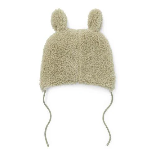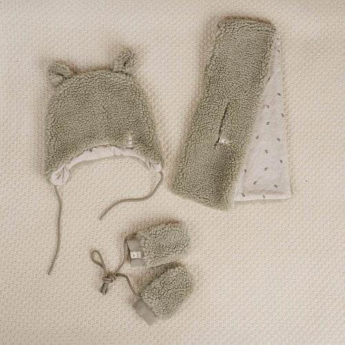 Little teddy ears! This cute soft green teddy hat with bunny ears keeps your baby warm and comfortable during winter walks. Made from soft organic cotton with a cuddly teddy exterior, it has an inner lining with a cute print of small leaves for a playful accent. The fine fit covers your little one’s ears and the hat can be fastened with cords. Designed to mix and match with the Newborn NOOS Little Farm collection, it is available in sizes 0-3 months and 3-9 months.