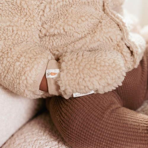 Warmth on the go! Ideal for keeping little hands warm during a winter walk. These sand-colored teddy mittens are made from soft and warm teddy material, keeping your little one’s hands cozy and protected from the cold. They are lined with soft organic cotton, adorned with a cute all-over Bunny print for a playful touch. The ribbed cuffs ensure the mittens stay on well, and the cord prevents them from getting lost. Mix and match with the Newborn NOOS Bunny collection. Available in sizes 0-3 months and 3-9 months.