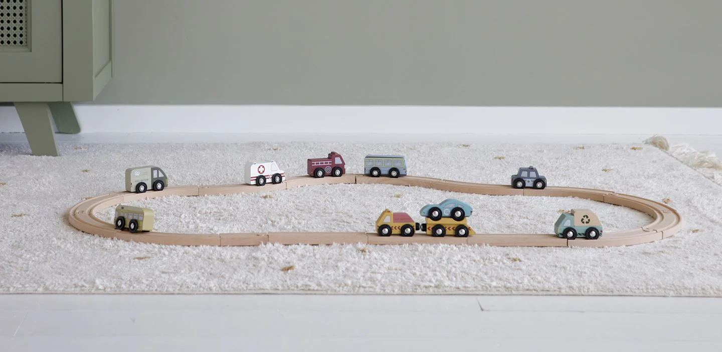 These wooden business and emergency vehicles are designed to be used together with the wooden train set from Little Dutch. The vehicles are suitable for driving on the tracks and providing assistance where needed in the city. Use the vehicles with the XXL train set and expansion sets for hours of playtime. No track pieces are included with this set.