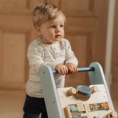 Walk, play, and learn! You will have so much fun discovering all the activities of this Forest Friends walker. Turn the gears to make the owl and acorn spin around! Give the mirror a spin! And learn to count together with the snail and the hedgehog. This wooden activity walker offers various challenging activities that support the development of your child’s motor skills. There are 8 activities to discover and master. Thanks to the balanced design, the walker is a great aid for children 12 months or older who are ready to take their first steps. Get ready for cheerful cheers as your little one moves through the house. The rubber wheels ensure that you don’t get scratches on your floor. To be assembled by an adult.