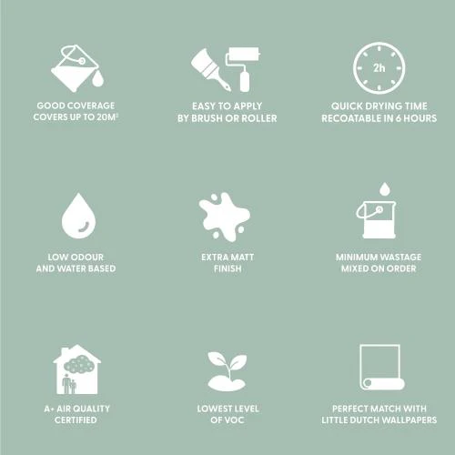 The Little Dutch wall paint extra matte Pure Blossom is part of a current color palette. All colors match the Fairy Garden collection of Little Dutch to complete your baby or children’s room. The colors have a gray undertone and fit the calm Scandinavian look. The covering wall paint has a matte luxurious effect. The matte wall paint is also suitable for wood and gets the appearance of chalk paint. Coverage area: 20m2