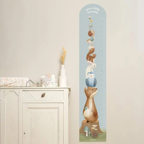 Keep track of how fast the little one grows with the growth chart wall sticker with Forest Friends theme! The growth chart features forest friends like the fox, hedgehogs, snails, the wise owl, and leaves and mushrooms. The wall sticker is easy to apply and remove, thanks to the high-quality, self-adhesive material. It is a single sticker, with a matte finish and transparent adhesive edge that gives a luxurious look. You can place it on walls and other smooth, hard surfaces. Ensure a clean and flat surface for the best result. Enjoy the rustic charm, every day again, with this cheerful and playful Little Dutch growth chart.