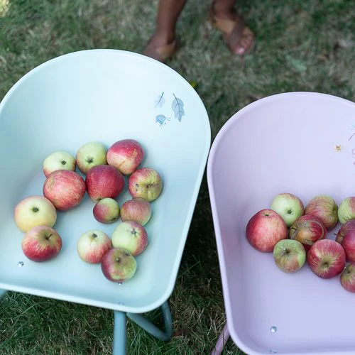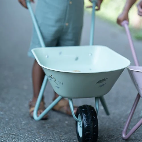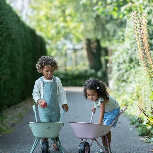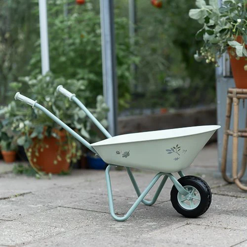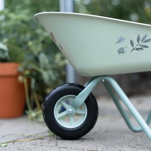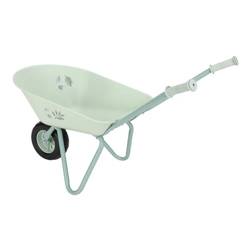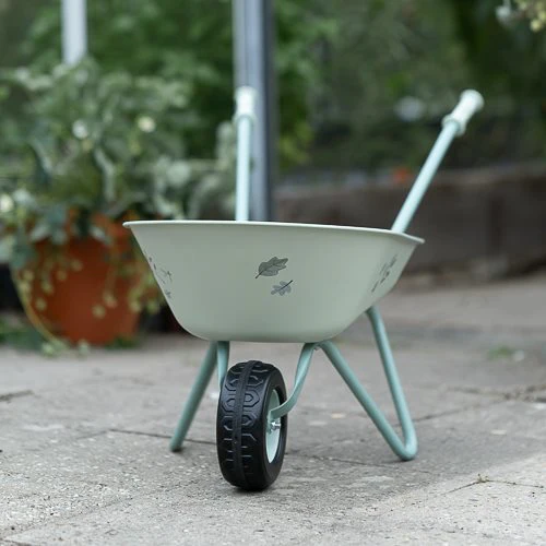 Bring joy to the garden with this sturdy wheelbarrow! Made of metal with plastic handles and a plastic wheel, it offers stability and convenience. The large tray is ideal for transporting soil, plants, or toys. With the cheerful colors and illustrations from the Forest Friends theme, this wheelbarrow adds a playful touch to any garden adventure. Perfect for young gardeners who love to be active!
