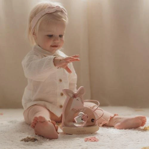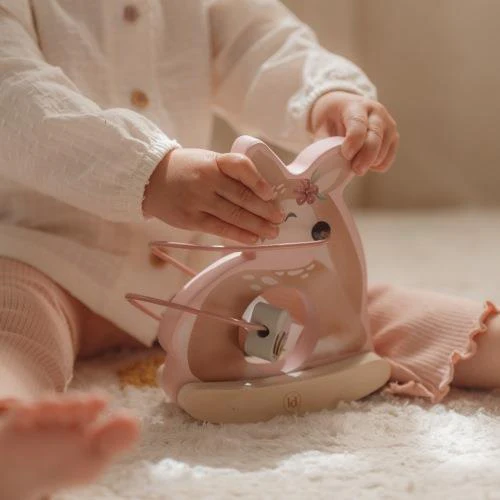 Let the beads spin one by one around the wooden deer while it rocks back and forth. This cute deer invites you to give it a little push, causing it to gently move to the hum of the bee fluttering around it. Along with the flowers, leaves, and mushrooms of Fairy Garden, the bee dances cheerfully along the spiral path around the deer. This lovely wobble toy not only playfully promotes motor skills but also looks beautiful as a decoration in the nursery.