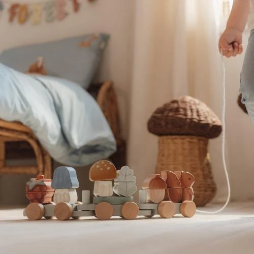 Choo choo! Gather all the cute animals, mushrooms, and treasures from the forest and hop on board for a magical journey. Stack the blocks one by one on the three wagons of this wooden stacking train and travel with the friends of Forest Friends. The squirrel takes the lead and sits at the front. Which mushroom follows and where does the pine cone belong? Each block forms a piece of the story of your imagination. A fun way to play and simultaneously develop hand-eye coordination. The train consists of 18 parts and is approximately 45 cm long.