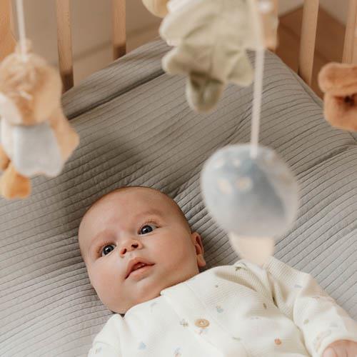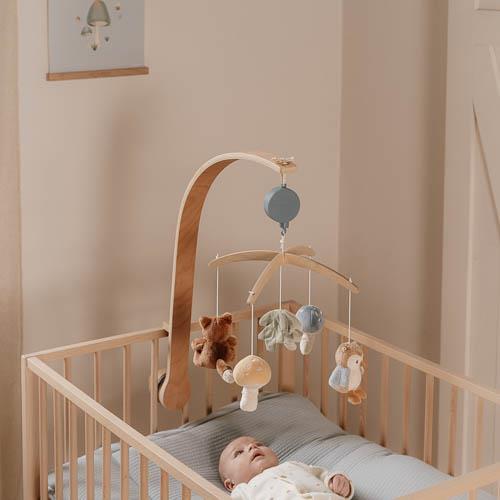 Follow the sound and watch how the little fox and the owl spin around. This beautiful wooden music mobile is soothing for babies thanks to the sweet lullaby. The mobile features five toys from the Forest Friends collection: a little fox, two mushrooms, an owl, and a leaf. Babies love to watch the movement of these toys, which stimulates their visual development. The music mobile is suitable from birth and easy to attach to the crib or playpen. WARNING Attach this toy out of the child’s reach. To prevent possible injury from entanglement, remove this toy when the child begins to try to sit up on hands and knees. Assembly by an adult is required.